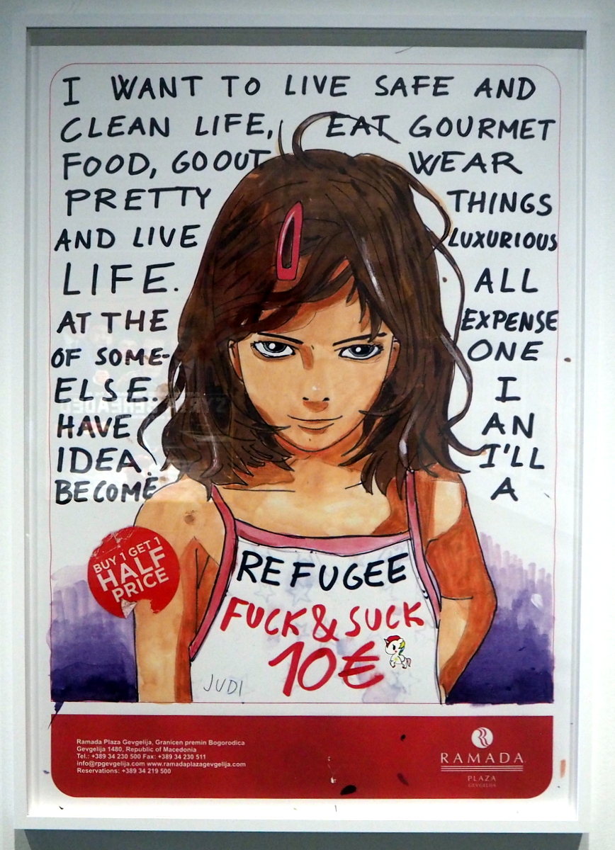 Näyttelyn keskeisiä teoksia ovat hotellien kirjepaperille tehdyistä piirroksista otetut suurikokoiset printit, joita on vielä täydennetty teksteillä. Vähintäänkin, olit pakolaisista ja maahanmuutosta mitä mieltä tahansa, nämä heittävät mielenkiintoisia näkökulmia aiheeseen.