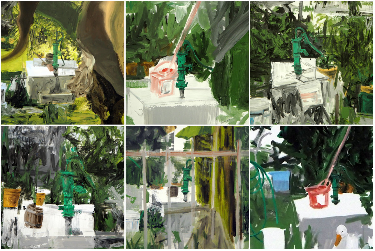 Kaikissa teoksissa on mukana vihreä pumppu, joka kokoaa työt hienosti kesäiseksi sarjaksi. Juuri tuollainen pumppu kuului minunkin lapsuuteni maisemaan!
