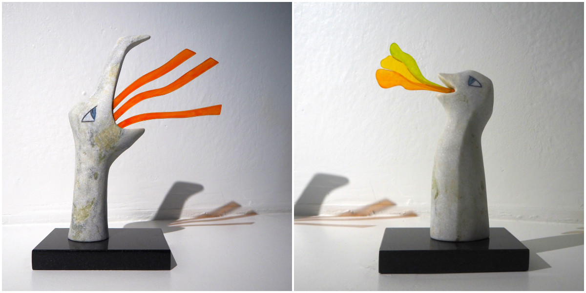 Näissä hahmoissa minua viehätti materiaalien yhdistely – ja voimakkaat värit yhdistettynä neutraaliin vaaleaan. Patsaat ovat oikeastikin näyttelyssä asetettuina näin vastakkain “huutamassa” toisilleen.