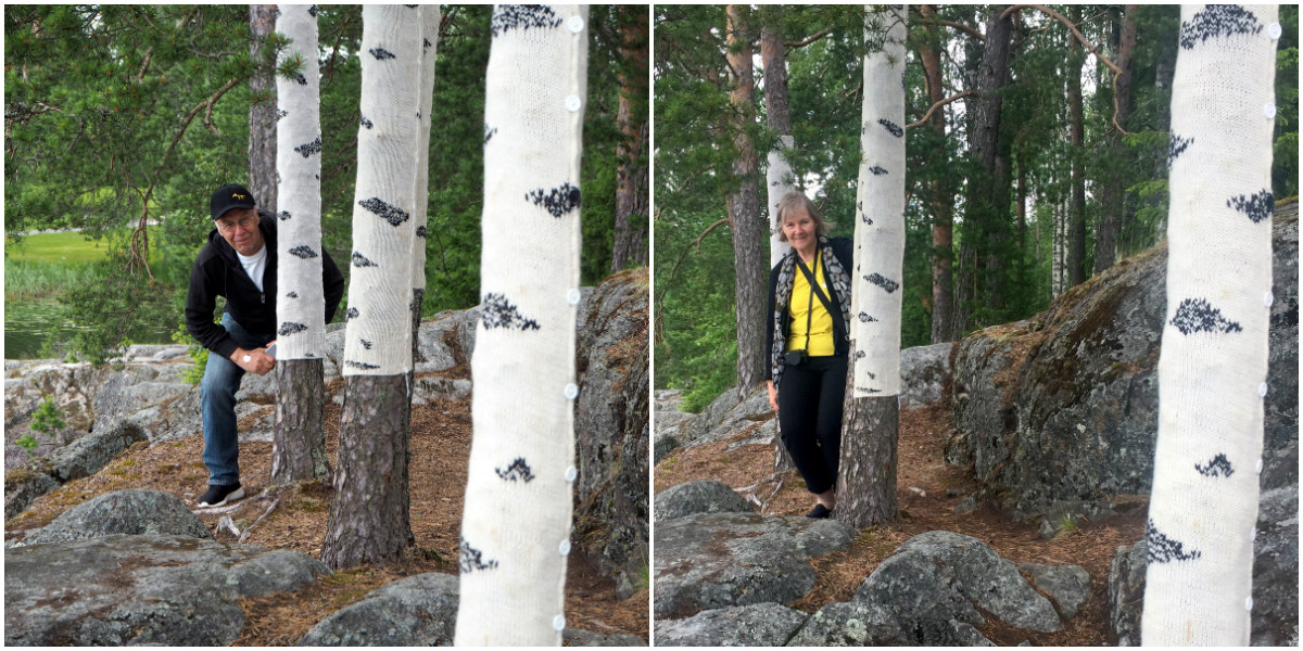 Kartat laatikossa eivät satunnaiselle kulkijalle oikein avaudu, mutta puiden käsinneulotut puvut avautuvat ja ilahduttavat. Kuljemmekin saaren ympäri vievää polkua kiirehtien puulta toiselle ja nauraen männyille, jotka ovatkin nyt koivuja!