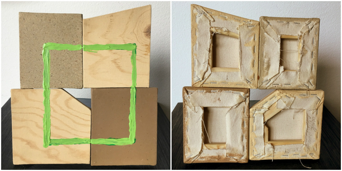 Tarkkaan teoksia katsova saattaa jo näyttelyssä huomata, että vanerinpala ei taida sittenkään olla vanerinpala. Ja näyttelyn lopussa onkin pieni teos, jonka saa ottaa käteensä, käännellä ja katsoa kummaltakin puolelta.