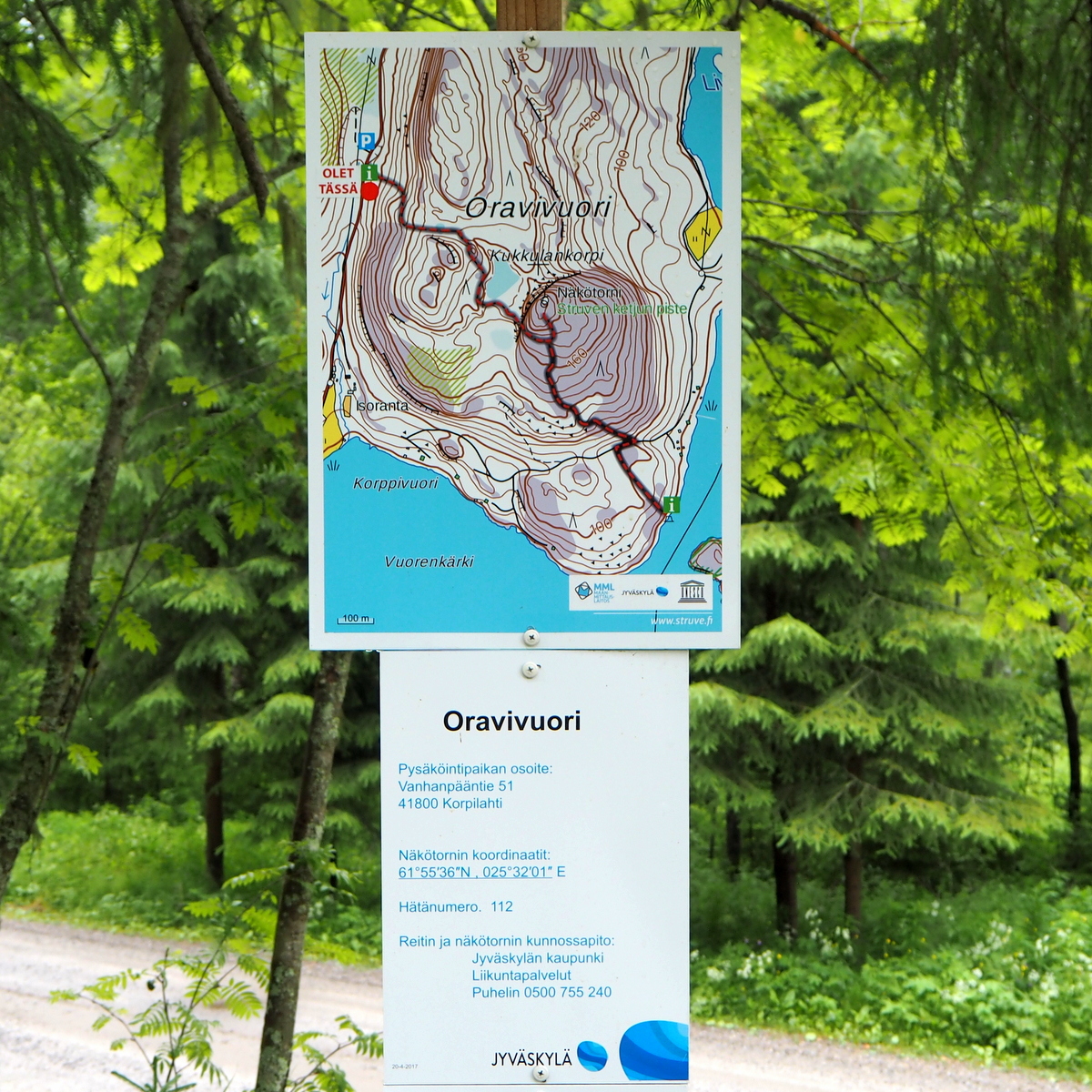 Vierailu jollain Struven ketjun pisteellä tuli osaksi Espoosta Ouluun ja takaisin kierrostamme suunnittelun viime metreillä, kun olimme jo päättäneet käydä Jyväskylässä ja luin sitten, huolimattomasti, Wikipediasta Oravivuoresta, että “Oravivuori on vuori Puolakassa Päijänteen tuntumassa entisessä Korpilahden kunnassa Jyväskylässä.”