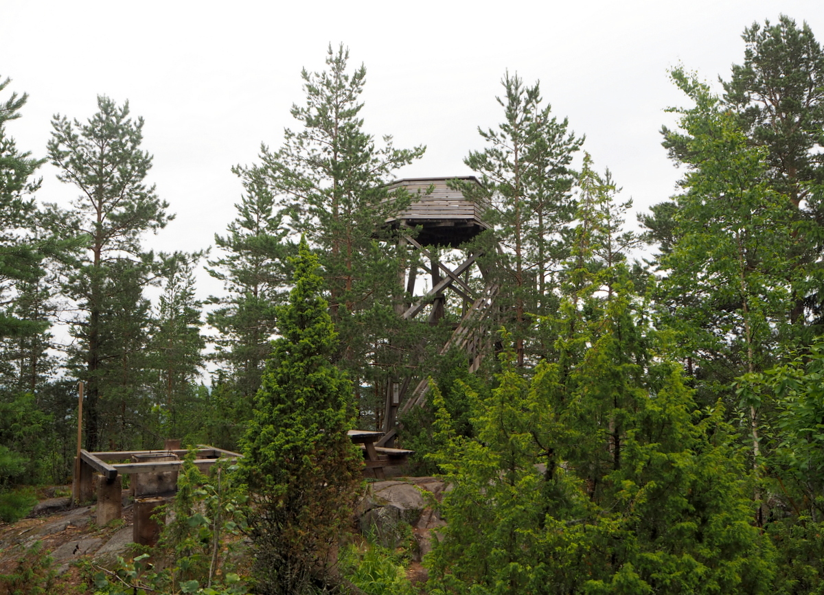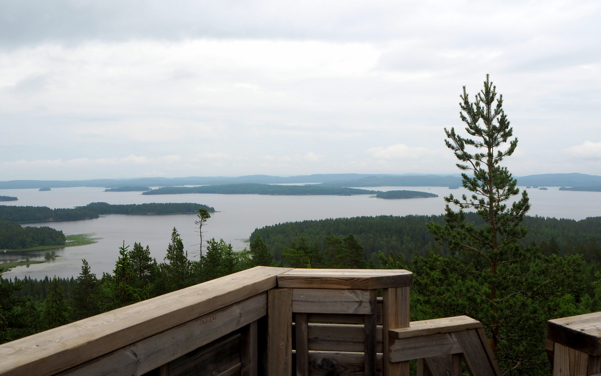 Lopulta kolmiomittaustorni tulee näkyviin ja kiipeämme vielä viimeiset askelmat ylös torniin, hiukan jo hikisinä, ihailemaan Päijänteelle aukeavaa maisemaa. Täällä emme enää olleetkaan itseksemme, vaikka matkan varrella emme olleet nähneet ketään: tornillehan pääsee myös toista polkua pitkin Päijänteeltä, jos paikalle saapuu veneellä.