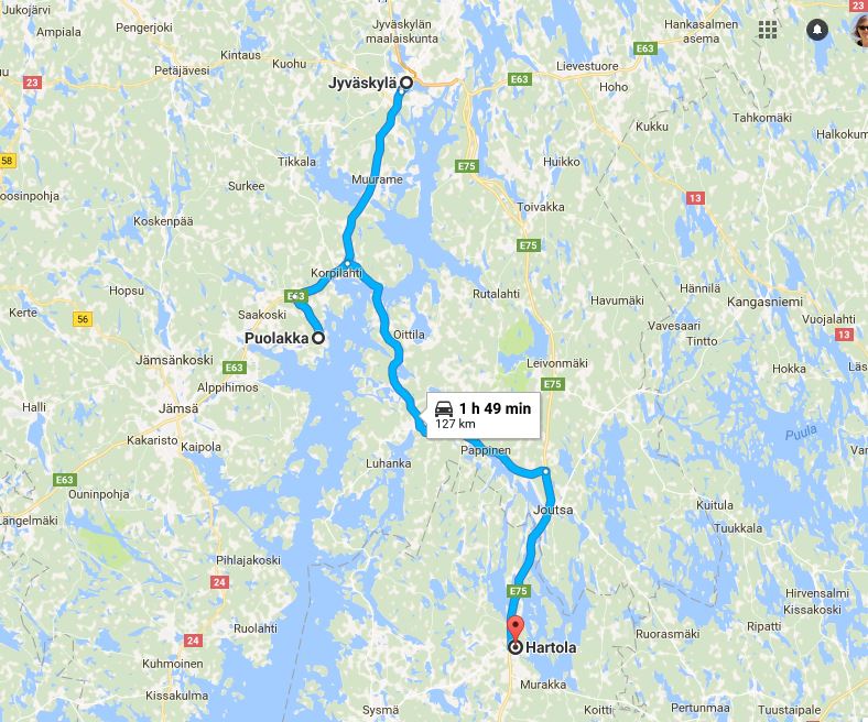 Asiaa sen tarkemmin tutkimatta ajattelin, että ok, poiketaan täällä samalla kuin käymme Jyväskylässä. Vasta edellisenä iltana, Pihtiputaan Kärväsjärvellä yöpyessämme, kävimme vähän tarkemmin läpi seuraavan päivän reittiämme Pihtiputaalta Petäjäveden kirkon kautta Jyväskylään ja edelleen Hartolaan, josta olimme varanneet seuraavan yöpymisemme. Tarkempi tutkimus Oravivuoren sijainnista osoitti sen olevan Päijänteen länsipuolella siinä missä yöpymisemme oli varattu Päijänteen itäpuolelta. Oravivuori ei myöskään ollut ihan Jyväskylässä, vaan Puolakkaan, on matkaa yli 40 kilometriä! Pohdin jo hetken Oravivuoren vaihtamista vaikka Porlammissa sijaitsevaan Struven ketjun pisteeseen ja sen yhdistämistä joskus myöhemmin tehtävään retkeen Verlan Unescon maailmanperintökohteeseen, mutta kun sitten löytyi sentään Kärkisten silta, jota pitkin siirtyminen Päijänteen länsipuolelta itäpuolelle onnistuisi ilman yletöntä määrää lisäkilometrejä, niin Oravivuori se on!