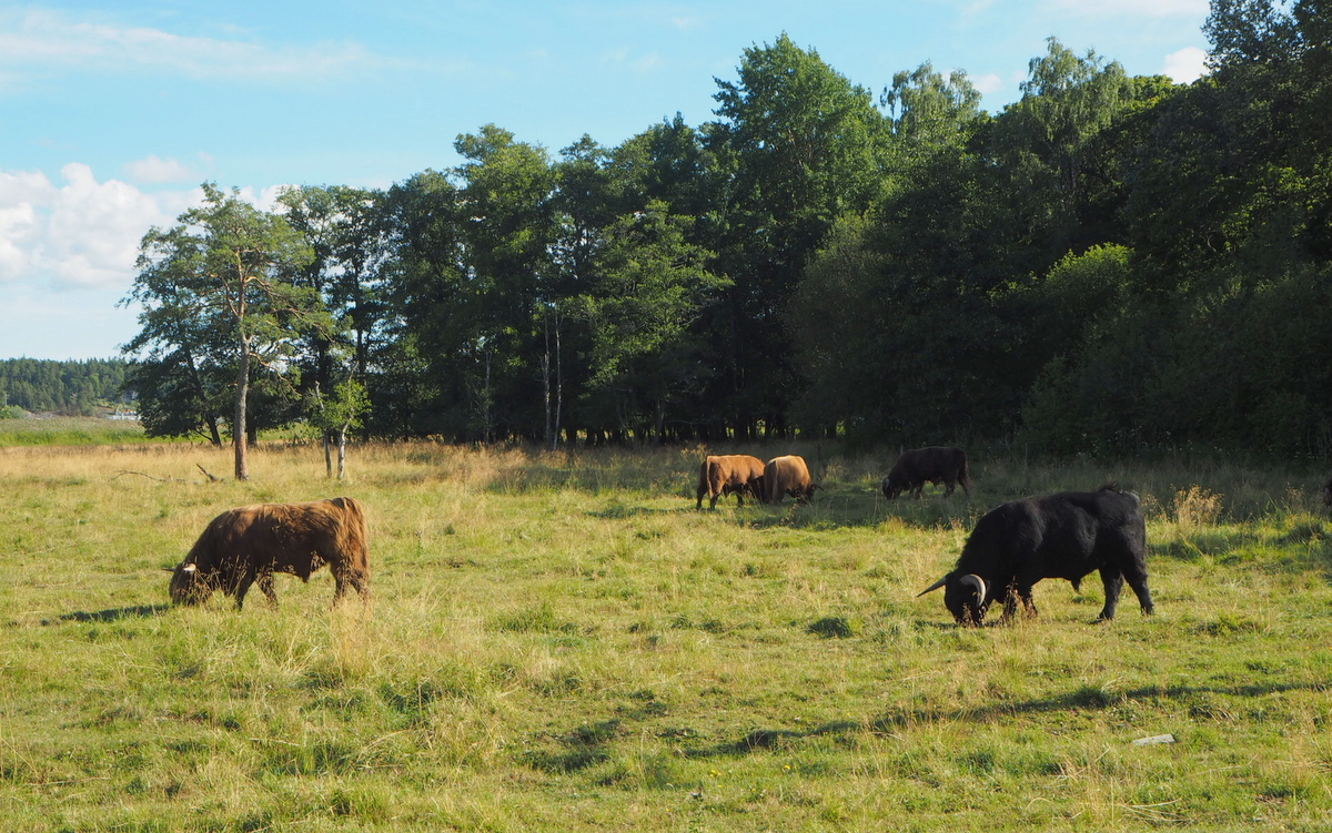 Ruissalon tietä reunustaa pyörätie ja pyöräily lehtimetsän siimeksessä on hyvä vaihtoehto tutustua saareen. Me valitsimme kohteiksi Honkapirtin kahvilan, jonka muistan jo kouluvuosiltani ja Turun Pursiseuran sataman ravintoloineen, joka oli meille tuttu veneilyvuosiltamme. Matka taittui vaihteettomilla vuokrapyörilläkin melko tasaisessa maastossa kivasti ja matkan varrella pääsi näkemään vehreää Ruissaloa vähän eri näkökulmasta kuin autolla. Ohitimme golf-kentän onnistuneesti saamatta yhtään palloa päähämme ja pysähdyimme paitsi kahvilassa ja ravintolassa myös ihailemaan laitumella olevaa karjaa. Kesäistä tunnelmaa vihreällä saarella.