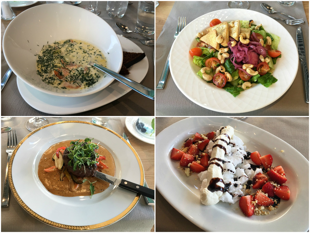 Illallisen nautimme ravintolan à la carte -puolella: lohikeittoa, tofu-salaattia ja pippuripihviä ja kruunasimme aterian vielä mansikkapavlovalla. Aterian jälkeen totesimme yhteen ääneen, että tännehän kannattaisi ajaa vaikka vaan syömään!