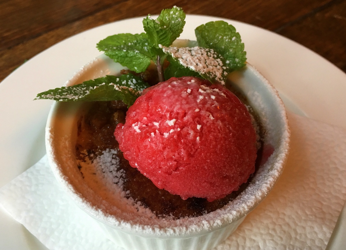 Jälkiruuan kohdalla valintaa helpotti vahva mieltymykseni crème brûléisiin: aina kun kyseinen vaihtoehto on tarjolla, otan sen. F-hoonen cème brûlée tarjoiltiin praliinien ja sorbetin kera. Nappivalinta sekin.
