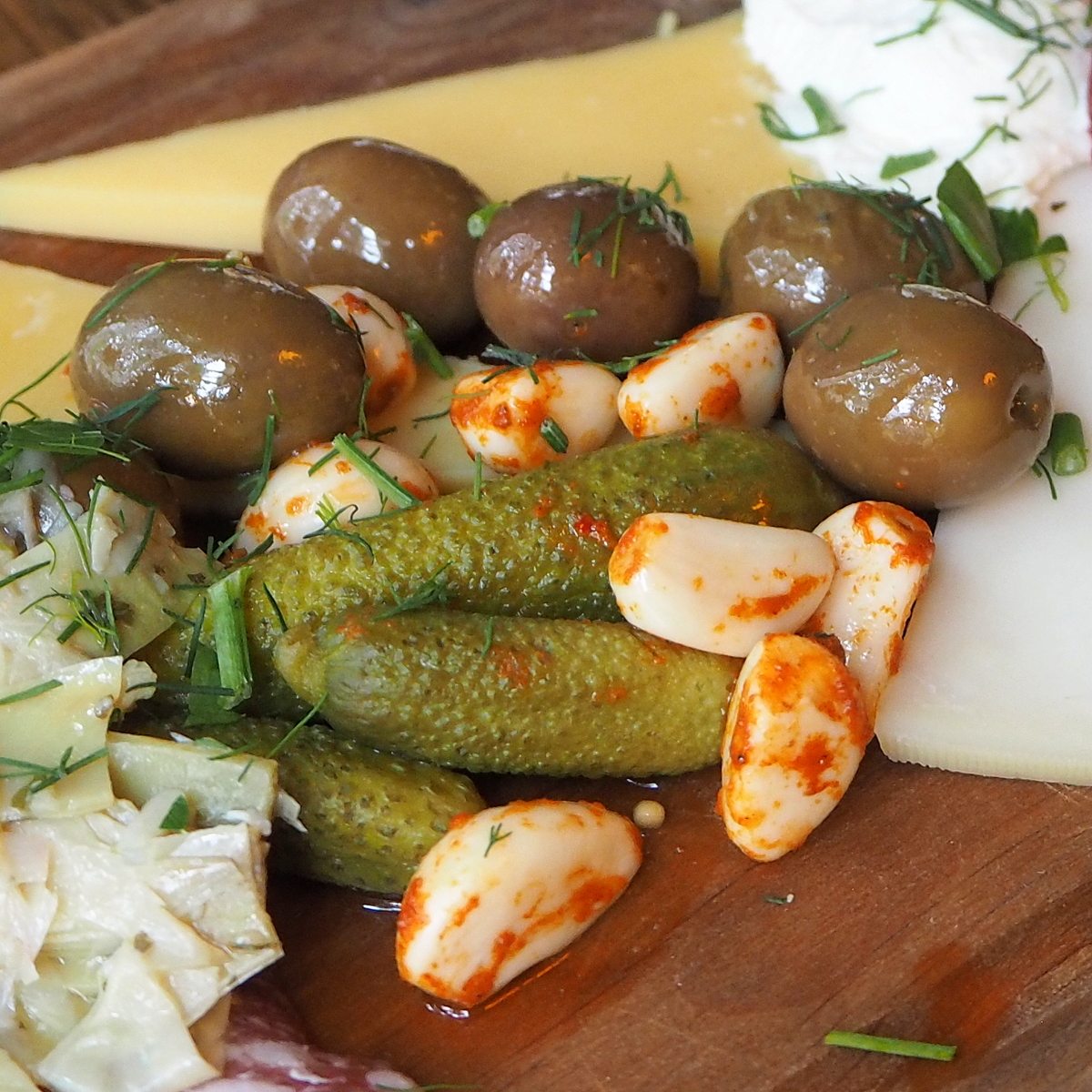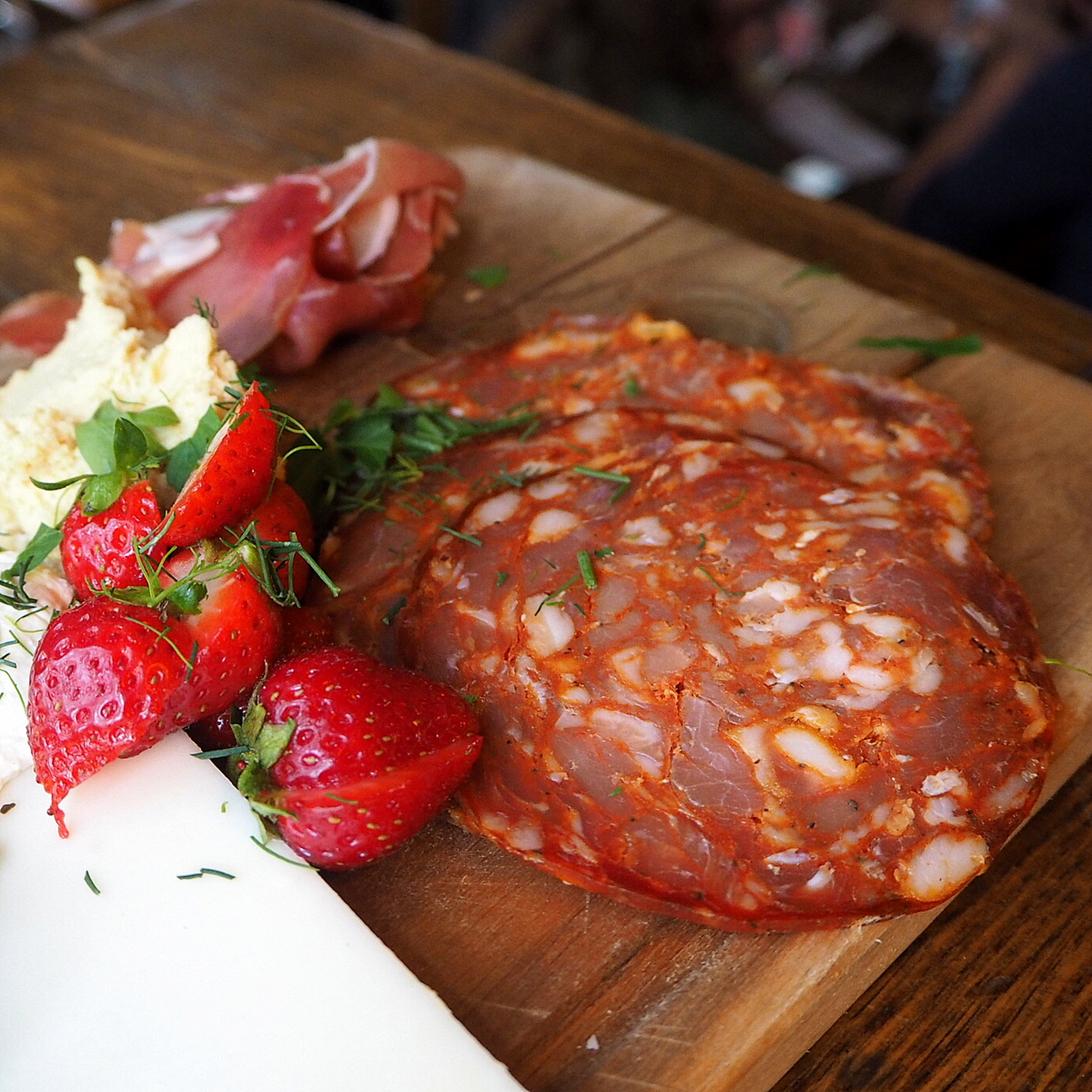 Päädyimme alkupalatarjottimeen (kahdelle), jossa oli juustoja, salameja, kinkkua ja vihanneksia – mutta yllätykseksemme ei leipää (vaikkakin myöhemmin Instagramissa katsoessamme näimme muiden samassa annoksessa olleen leipääkin).