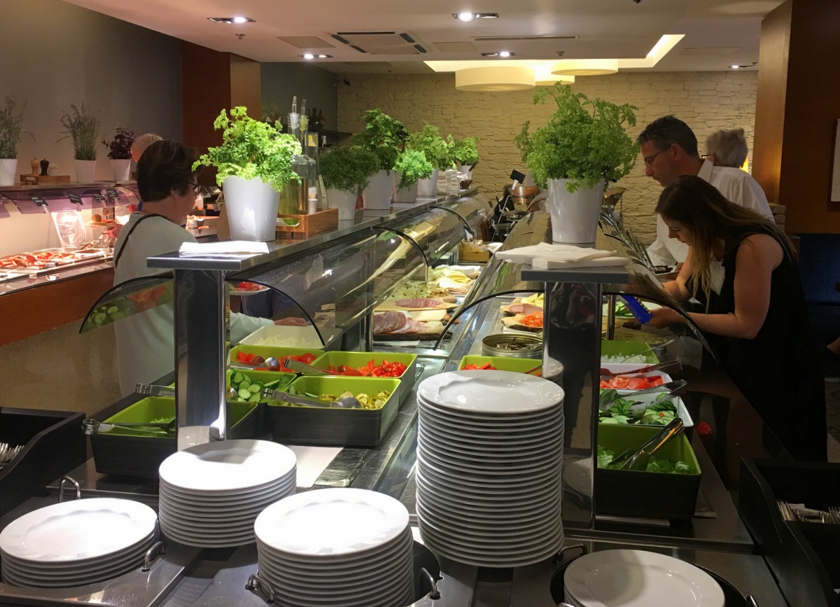 Pöytävaraus näytti olleen hyvä idea – vapaita pöytiä oli vähän ja niissäkin useimmissa lappu, että mistä alkaen ne ovat varattuja. Asetuimme siis onnellisina varauksesta meille osoitettuun ikkunapöytään, vaikka se hiukan kiipeämistä vaatikin ja aloimme suunnitella kolmen ruokalajin illallistamme.