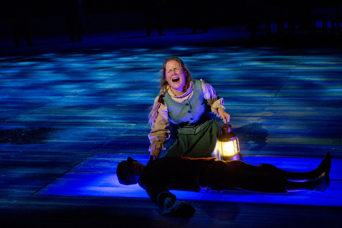 Musikaali alkaa rajulla kohtauksella Simskälan kylän odottaessa miehiään mereltä palaavaksi, mutta tälläkään kertaa kaikki eivät tule takaisin. Sadetakkien avulla toteutettu menetettyjen miesten läsnäolo näyttämöllä on vaikuttava.