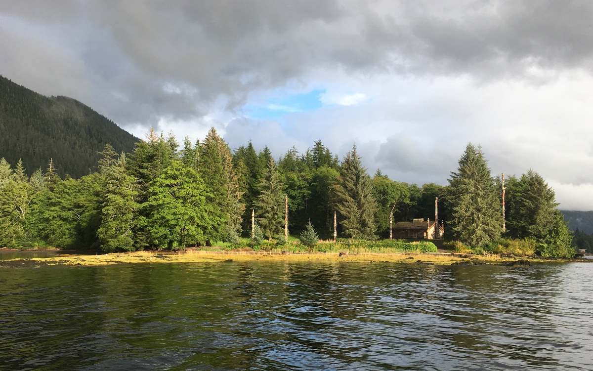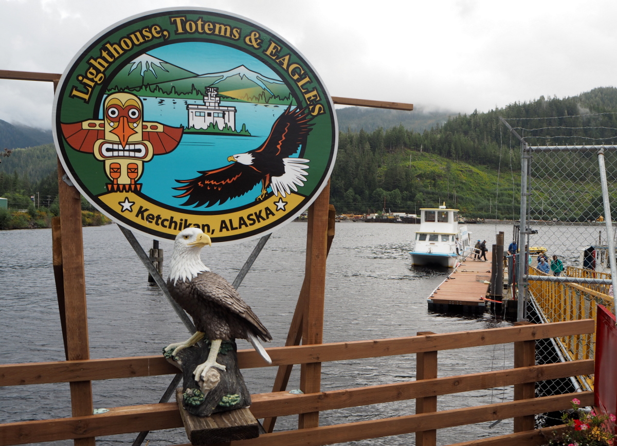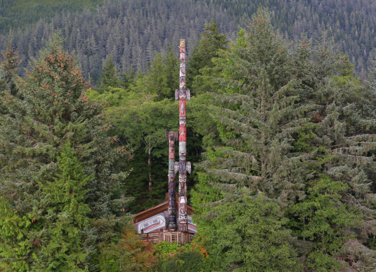 (Alimpien kuvien toteemit ovat Ketchikanin kaupungista, eivät veneretkellä ohittamaltamme saarelta.)