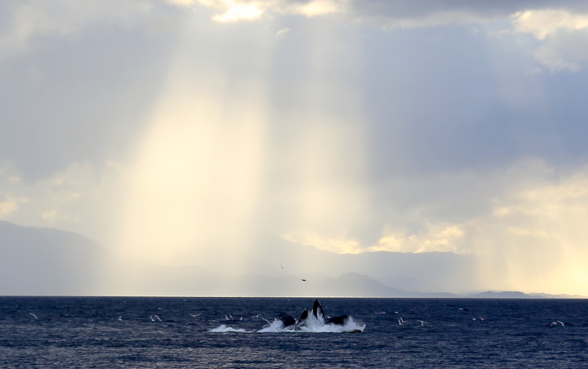 Kotkien jälkeen saavuimme majakalle, mutta mielenkiintoimme siihen lopahti melkein jo ennen kuin alkoikaan, sillä näimme ensimmäisten valaanpyrstöjen painuvan aaltoihin. Hetken päästä näimme muutaman valaan selän majakkasaaren rantavesissä ja vähän ajan päästä useamman valaan nousevan yhtä alkaa vauhdilla pintaan. Ryhävalaat harrastavat ainakin näillä vesillä ilmeisen yleisestikin tällaista bubble-net feeding -ilmiönä tunnettua yhteistyötä ravinnon hankkimiseksi: valaat uivat kalaparven alle puhaltaen yhdessä kuplia, jotka saavat kalat nousemaan pintaan ja sen jälkeen valaat nousevat ryhmänä pintaan suut valmiiksi auki keräten kalat avonaisiin kitoihinsa – kätevää! Onnistuimme näkemään parikin kertaa valasryhmön nousevan vauhdilla pintaan, mutta ilmiön vangitseminen kuvaksi oli silti haastavaa.