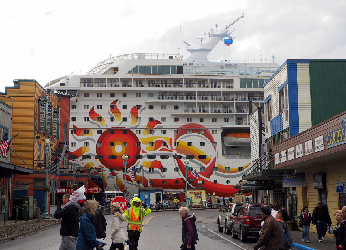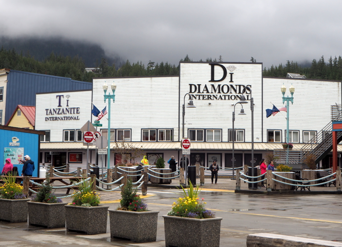 Ketchikanissa Norwegian Sun, kuten muutkin tuolloin satamassa olleet kolme risteilylaivaa, mm. Disney Wonder, pääsivätkin ihan kaupungin keskustaan: vain portaat alas ja olet timantti- ja tansaniittikaupoissa. Jos nyt joku niissä haluaisi käydä. Toisaalta en sittenkään ole vakuuttunut siitä, että jalokivien ostaminen pikaisella vierailulla vieraassa kaupungissa olisi hyvä idea, toisaalta nämä kaupat lienevät sitä risteilybusineksen arveluttavinta puolta: nämä kaupat eivät työllistä paikallisia eivätkä taida juuri jättää rahaa kaupunkiin.