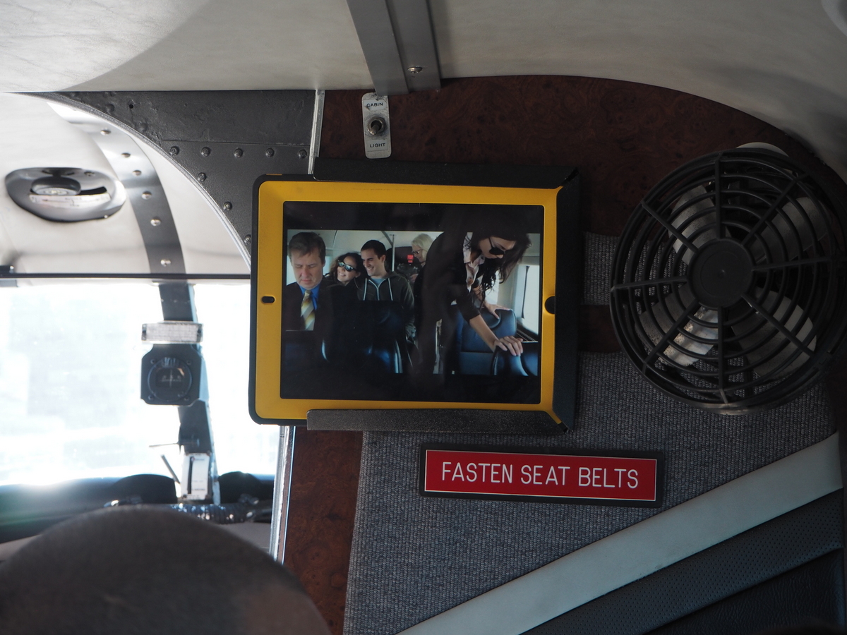 Vielä turvallisuusinfo: lentäjä lätkäisee tarranauhalla varustetun tabletin matkustamon seinälle ja laittaa videon pyörimään ja sen loputtua laiturilla oleva avustaja työntääkin jo koneen laiturista ulospäin ja lähdemme.