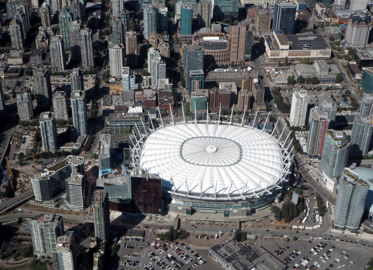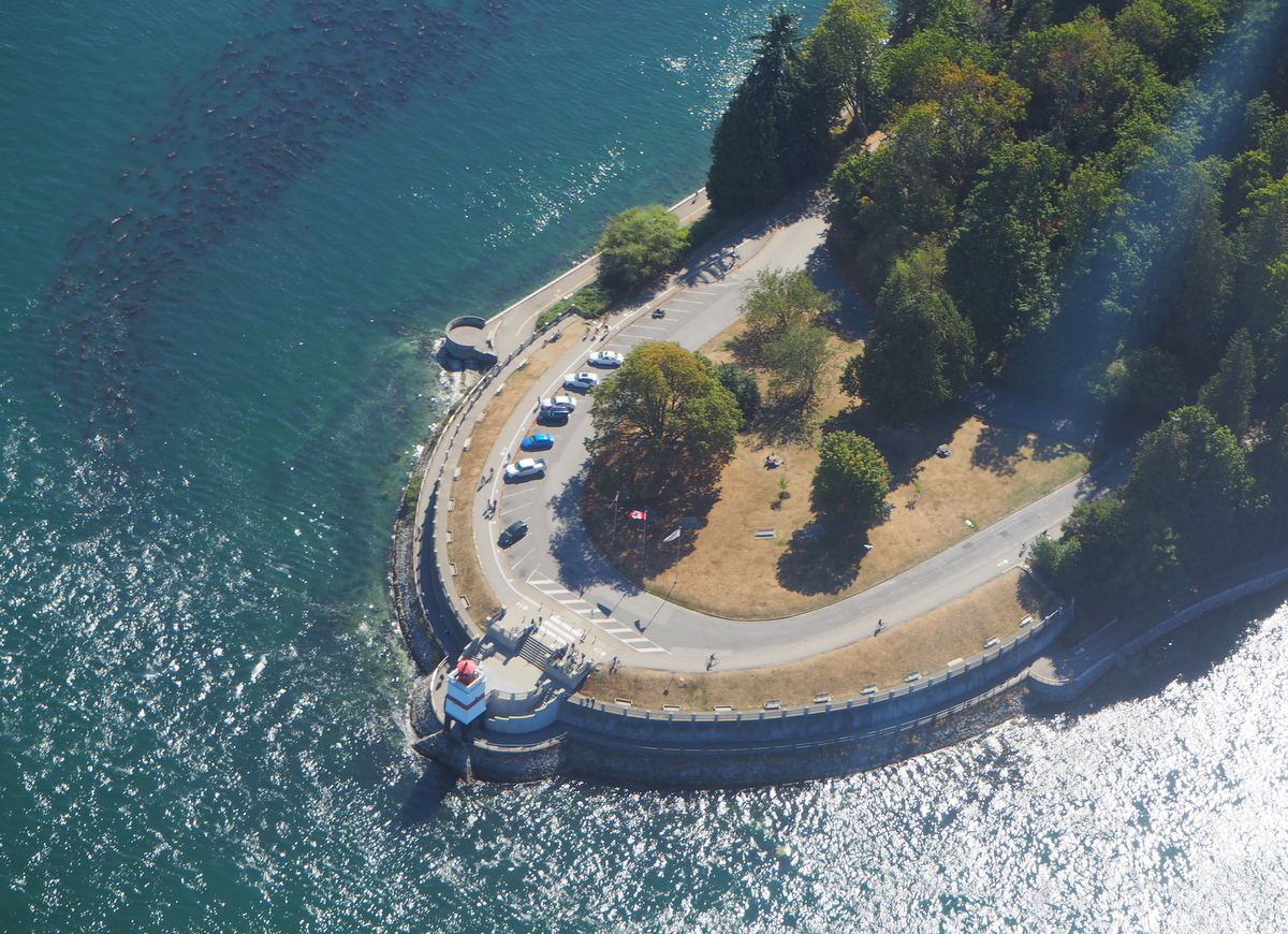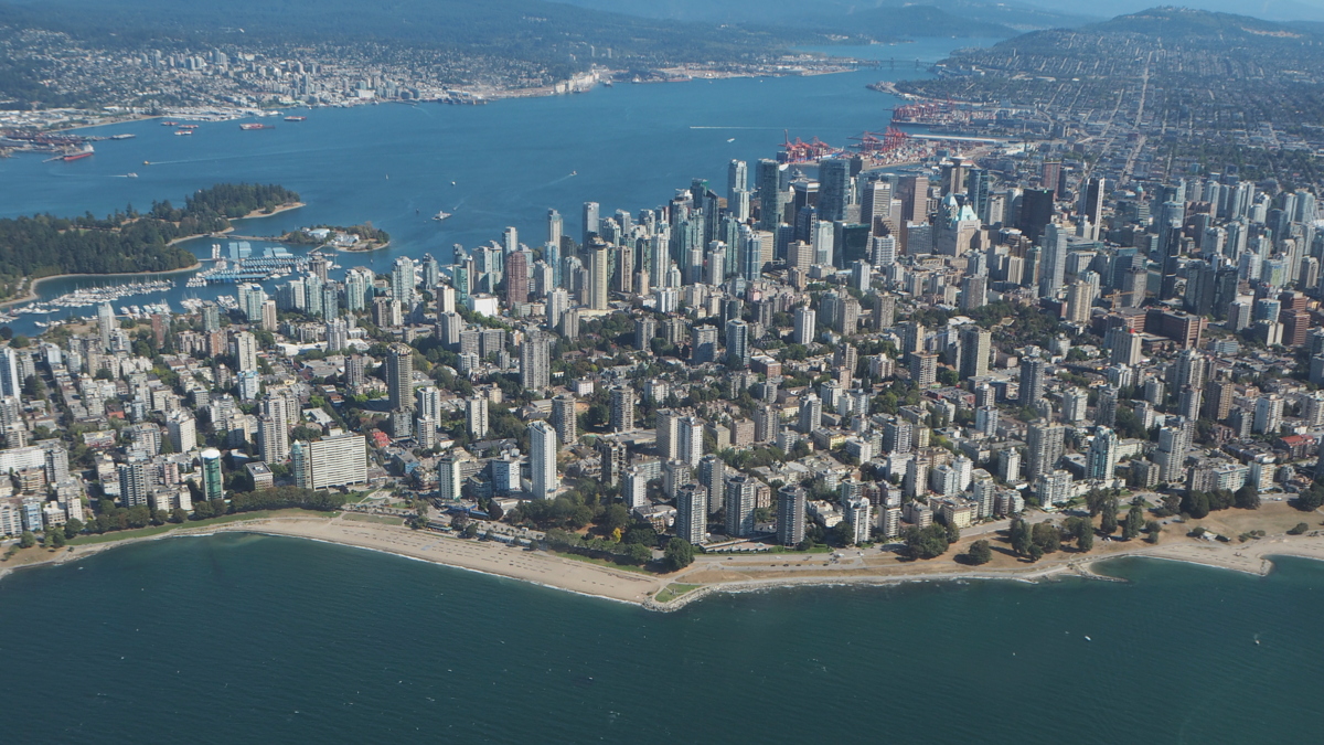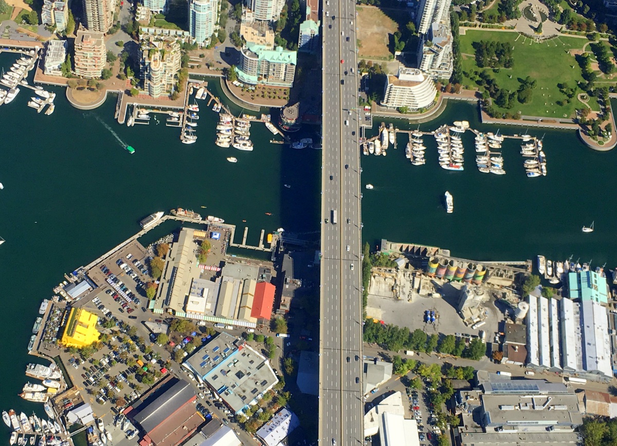 Käymme myös katsomassa Vancouver Islandille lähtevien lauttojen satamaa ja läheisiä saaria ennen kuin kaarramme takaisin keskustan suuntaan False Creekille. Näemme ilmasta Granville Islandin, jossa nautimme lounaan pari päivää sitten. Lennämme Vancouver Canucksien Rogers Arenan yli. Joka puolella on pienvenesatamia – Vancouver on merellinen ja vihreä kaupunki.