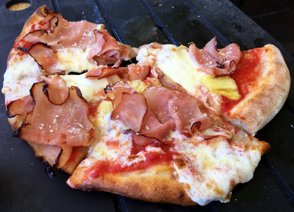 Maleksittuamme pääkadun edes takaisin päädymme pizzalle, vaikka laivalla olisikin taas ruokaa tarjolla sinne palatessamme: ilmainen wifi ja rantaravintolan tunnelma houkuttelevat. Pi Artisan pizzerian Pi 808 -pizza houkuttelee nimellään, ja kun ainesosatkin (mozzarella, italiainen kinkku, ananas) kelpaavat molemmille niin tilaamme paikan nimikkopizzan. 808, Havaijin puhelinaluekoodi on napattu siellä täällä kauppojen nimiin, täällä pizzan nimeen.