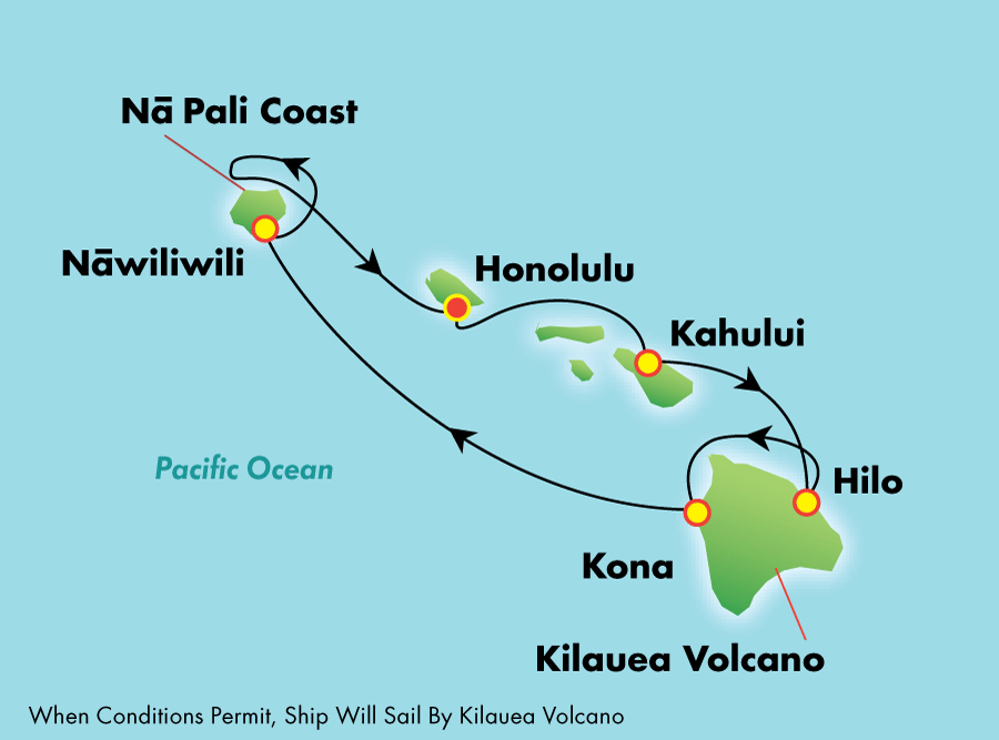 Saarten nimet eivät tuossa laivayhtiön tekemässä reittikartassa näy, mutta siis Honoluluhan on Oahulla, Kahului oli satamamme Mauilla, Hilo ja Kona Big Islandilla ja Nawiliwili Kauailla.
