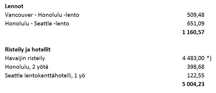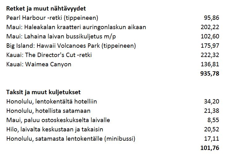 Mutta asiaan, eli Havaijin osuuden kuluihin – alla oleva erittely siis ilman Helsinki – Seattle – Helsinki -välin lentoja, sillä ne olivat mukana Alaskan risteilyn kustannuserittelyssä, kahdelta hengeltä n. 1 700 euroa.