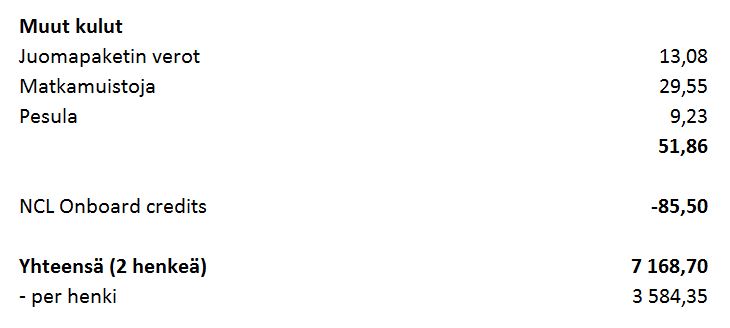 Norwegian Cruise Line myy Euroopassa kaikki risteilyt nykyisin All-inclusivena, joten meillä oli kattavat juomapaketit, mutta “verollisella” risteilyllä kaikki juomaostokset piti silti ensin “maksaa” ja sitten seuraavana yönä hyttilaskusta pyyhittiin niiden osalta pois muut kulut paitsi verot. Kahdelta hengeltä ei sitten lopulta kuitenkaan jäänyt veroja maksettavaksi kuin tuo 13 euroa, mutta prosessi oli kyllä vähän työläs ja sotkuinen.