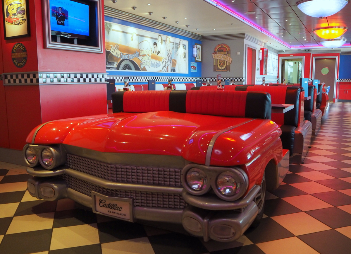 Kuudennen kannen Cadillac Dinner -ravintola oli ovela sisustukseltaan ja auki kai ympäri vuorokauden, mutta emme valitettavasti löytäneet sen ruokalistalta kovin moneksi ateriaksi mieluisia vaihtoehtoja. Tämä ravintola levittäytyi myös kannelle, joka Havaijin lämmössä jossain tilanteessa onkin varmaan mukava vaihtoehto, vaikkemme sitä melko myöhään illalla ravintolassa käydessämme tulleetkaan testanneeksi.