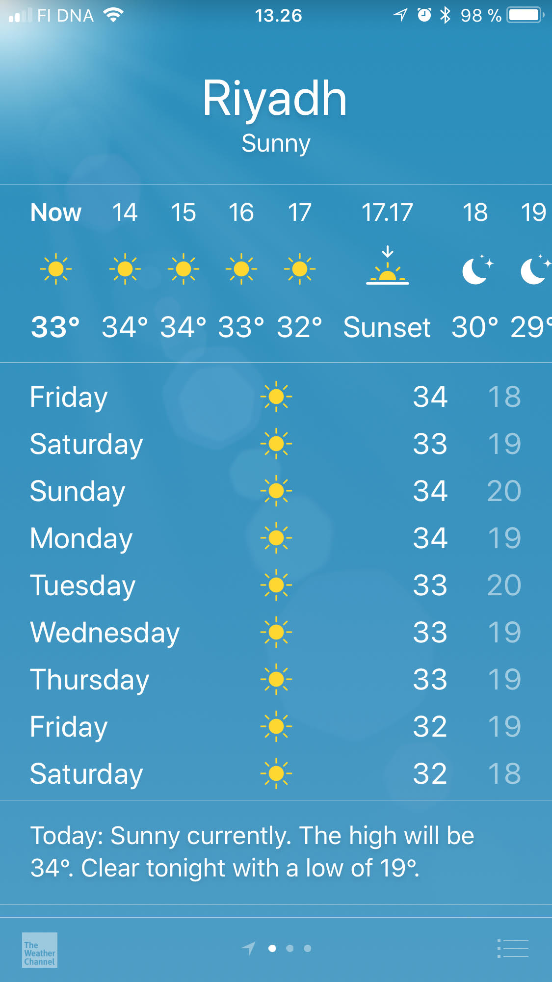 Saudi-Arabiaan ei parane mennä kesällä, sillä toukokuusta syyskuuhun päivälämpötilat huitelevat 40 asteen tuntumassa. Marraskuun alkuun mennessä keskilämpötila on laskenut runsaaseen 20 asteeseen ja tulevan viikon sää näyttää tältä. Ruskettumisesta ei kuitenkaan ole vaaraa, naisilla ainakaan, sillä abaya peittää kyllä tehokkaasti.