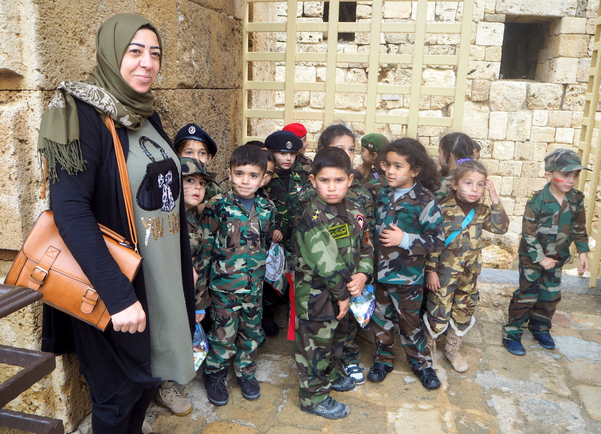 Olimme Sidonissa tiistaina 21. marraskuuta, Libanonin itsenäisyyspäivän aattona, ja maan sotainen historia tuli meitä vastaan ensimmäisen kerran päiväkotiryhmien muodossa. Itsenäisyyspäivän kunniaksi lapset oli puettu maastokankaisiin sotilasunivormuihin, siis ihan pienetkin, arviolta 3-4 -vuotiaista alkaen. Näitä ryhmiä tapasimme merilinnakkeella, jonne hekin olivat itsenäisyyspäivän aattona suunnanneet retkelle.