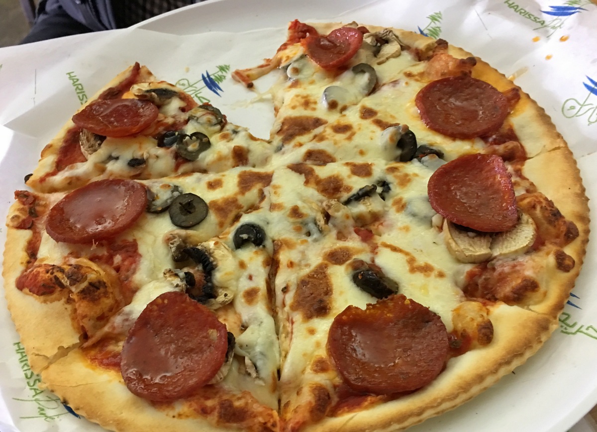 Harissan ravintolat tarjosivat meille kaikille myös mahdollisuuden pizzalounaaseen, kunhan selvitimme sen tilaamiseen liittyvän rituaalin, eli valinta yhdellä tiskillä, maksu toiselle tiskille ja sen jälkeen tieto tilauksesta ja maksusta kolmannelle, joka lopulta sitten valmisti pizzan, jonka sen jälkeen saattoi nimellä sieltä noutaa. Pizzat olivat kyllä ihan hyviä, tai sitten olimme vaan tässä vaiheessa päivää jo nälkäisiä.