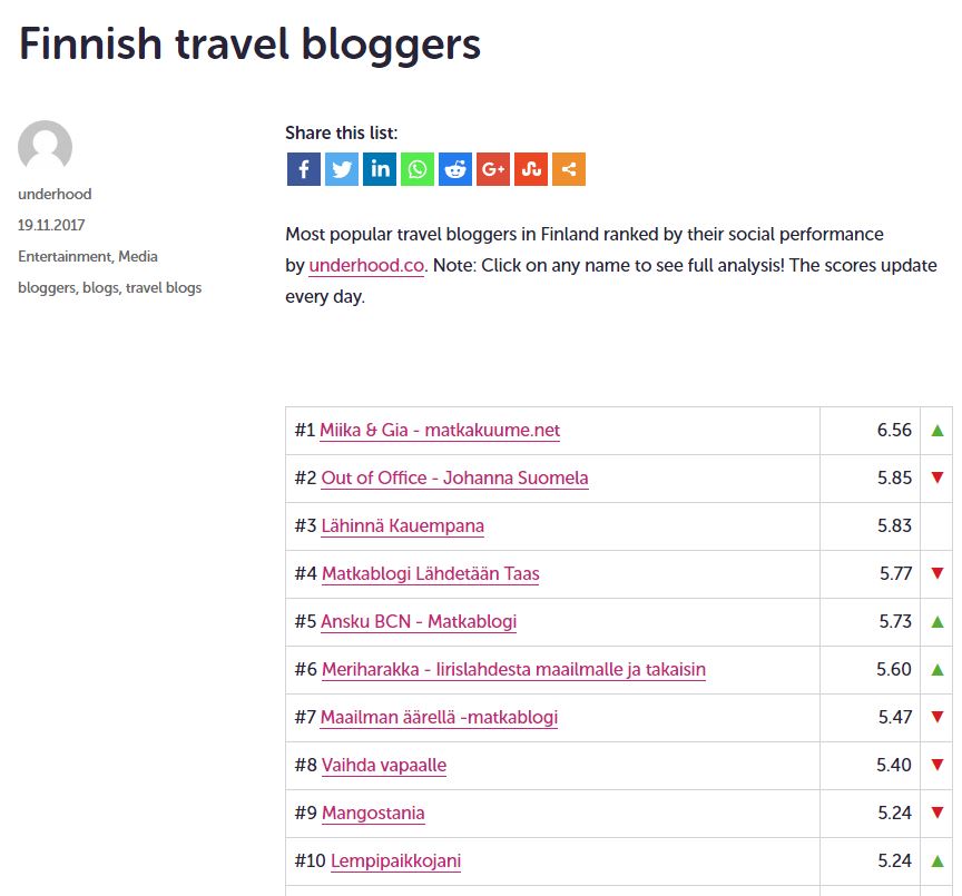 Viimeisimpänä blogimittarina Underhood-niminen toimija on aloittanut suomalaisten matkablogien päivittäisen rankingin. Tämä lista kertonee jo enemmän siitä, että missä määrin eri blogit ovat julkaisseet uusia juttuja lähipäivinä kuin blogin pysyvämmästä suosiosta.