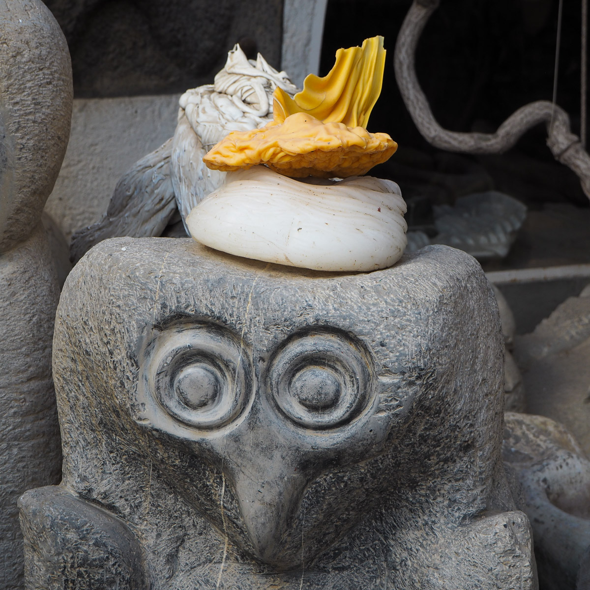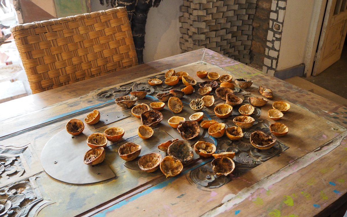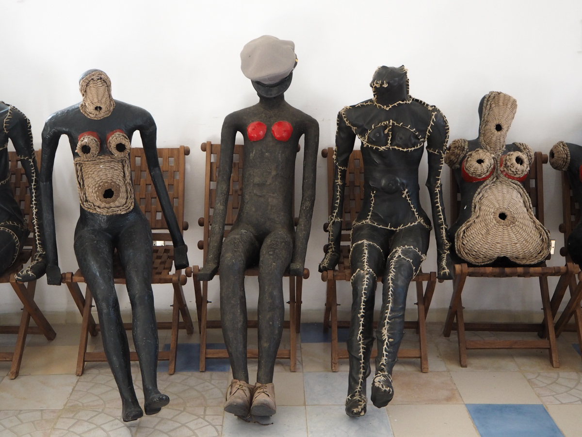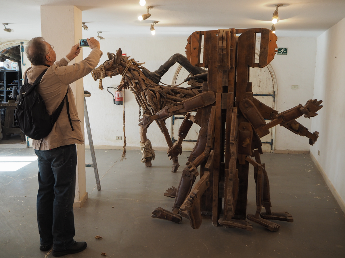 Pihalta meidät johdateltiin huone kerrallaan sitä useammassa kerroksessa ympäröiviin tiloihin, joissa teokset olivat välillä puuta, välillä kiveä, välillä pöydälle kuivumaan jätettyjä hedelmän kuoria – ja sitten seuraavaksi koko huoneen täyttäviä veistoksia.