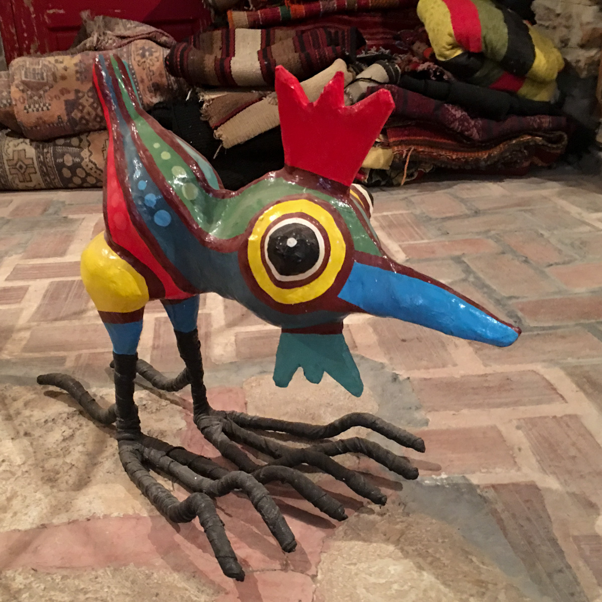 Monet alakerran huoneista olivat pimeitä, lähes ikkunattomia, mutta oppaamme sytytti niihin valot vierailumme ajaksi. Ihailimme värikkäitä lintuja ja punaisia ei minnekään, tietenkään, johtavia kierreportaita ja ehkä hiukan vaivautuneina siitä, että olimme museon ainoat vieraat olimme taas mielessämme jo palaamassa sinne etupihalle – olimmehan jo nähneet paljon enemmän kuin osasimme kuvitellakaan.
