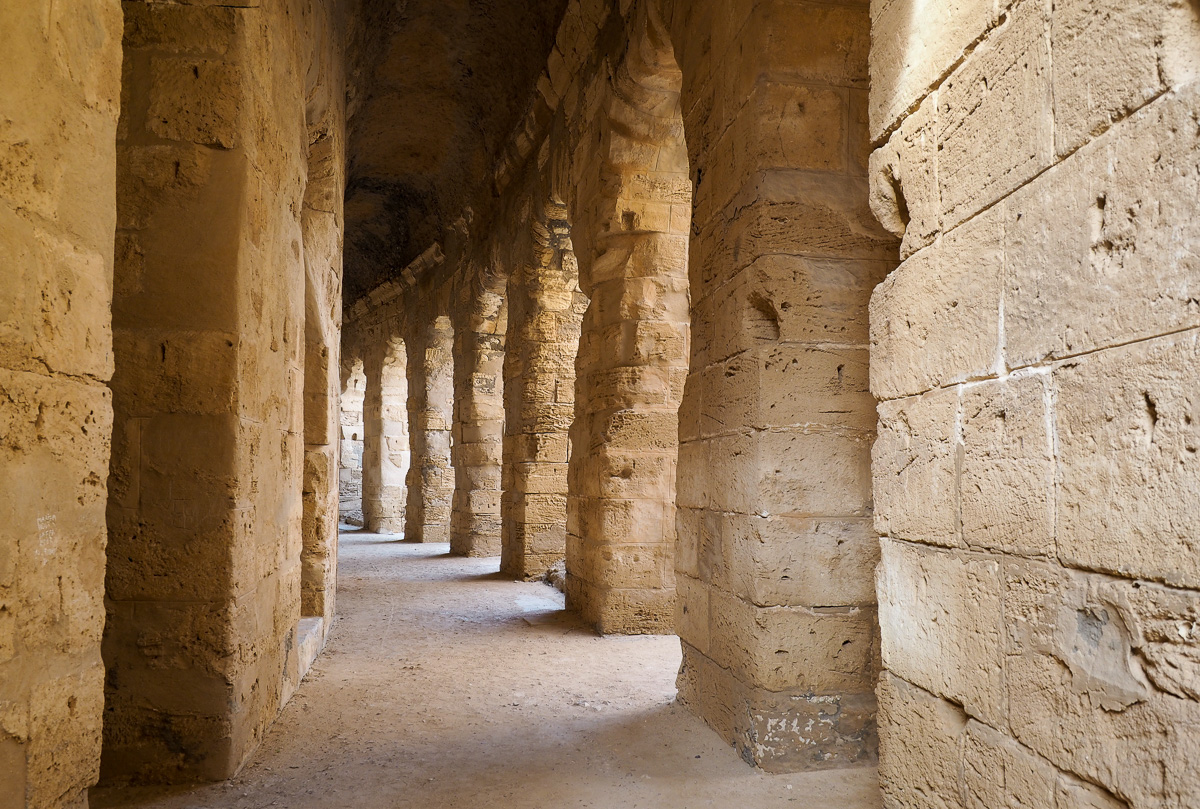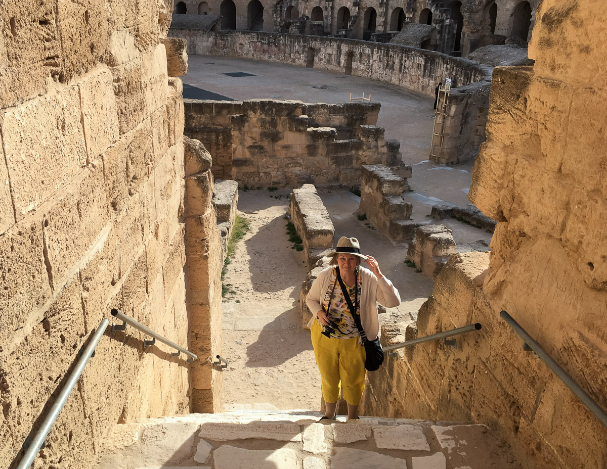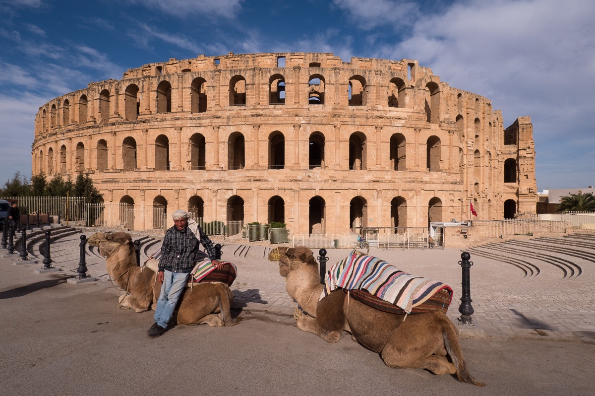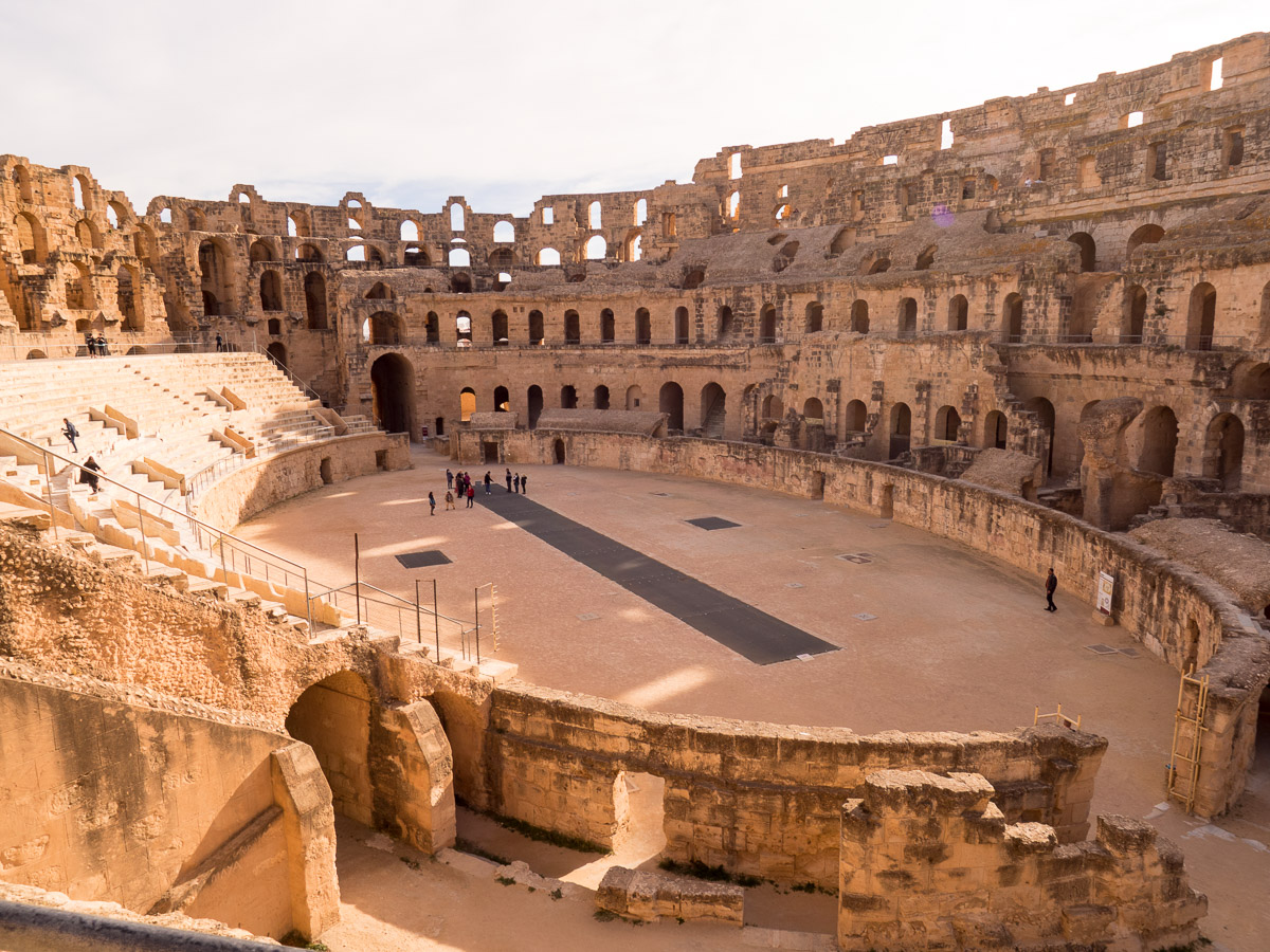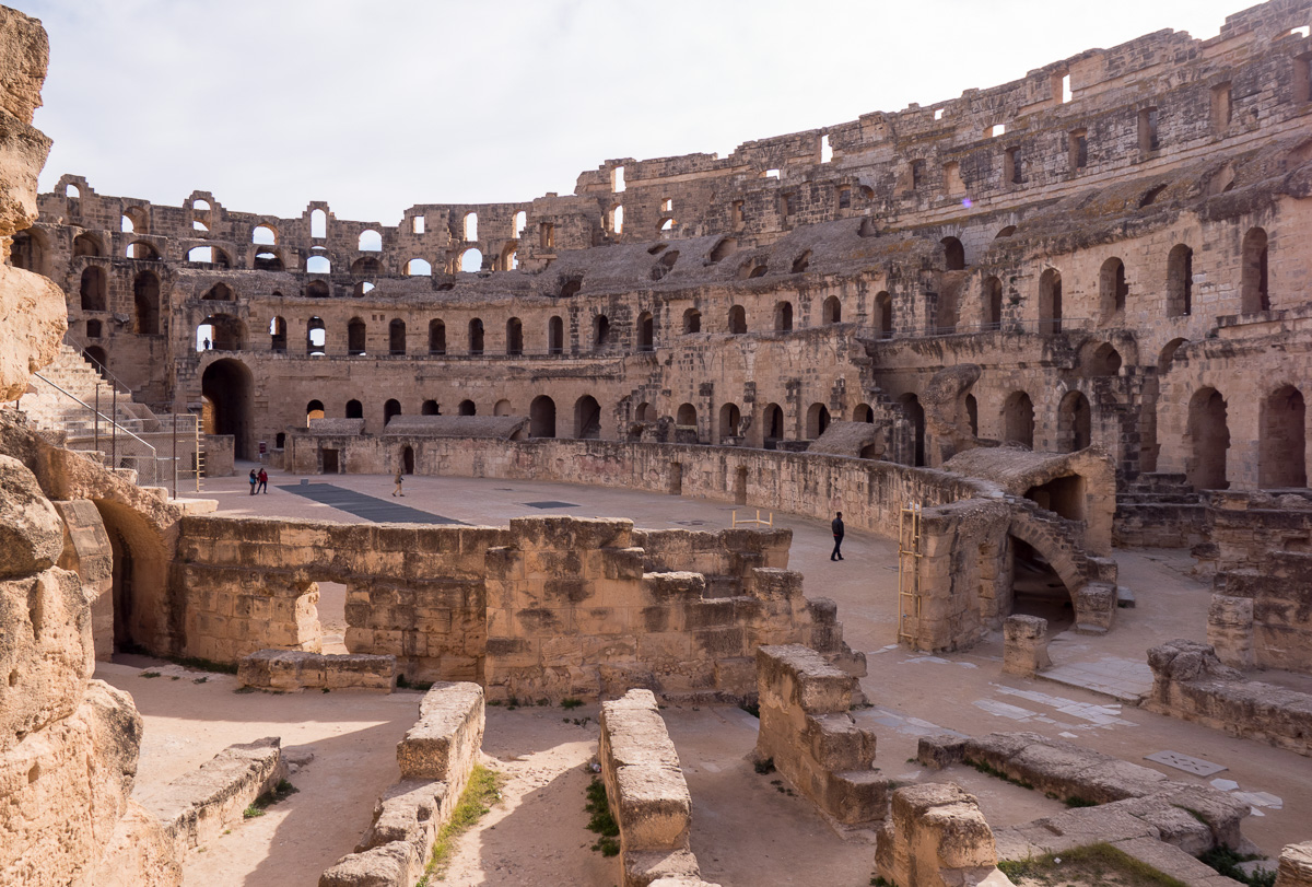 Colosseumiin verrattuna El Jem on mukavan ruuhkaton kohde, jota pääsee laajalti kiertämään niin ylhäällä kuin alhaalla, aina amfiteatterin alla olevia eläinsuojia myöten. 200-luvun alussa rakennettu amfiteatteri ei koskaan valmistunut kokonaan, mutta sitä käytettiin kuitenkin näytöksiin, eli täällä gladiaattorit ovat taistelleen leijonia vastaan kuten muillakin areenoilla: sirkushuveja kansalle, leivän lisäksi.