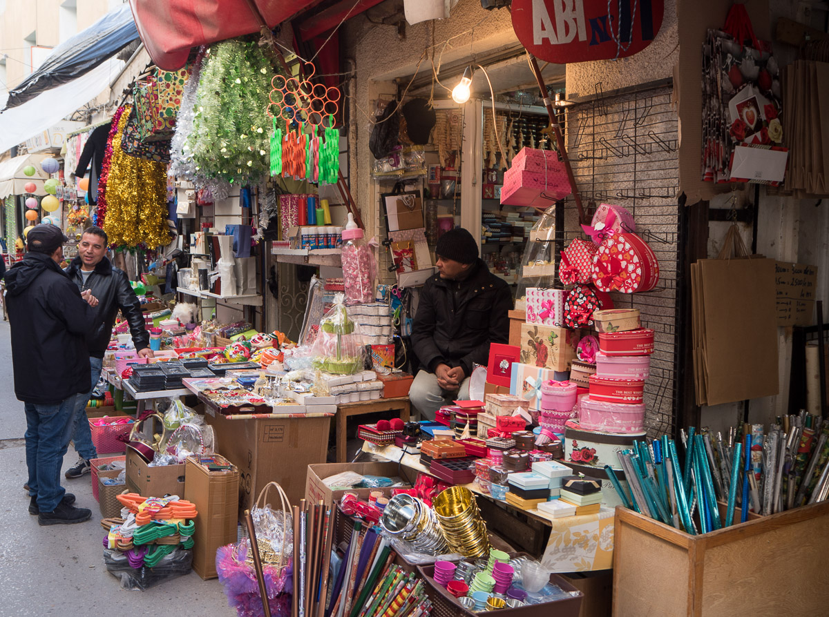 Tunisin medina oli aika erilainen kuin muut Tunisiassa näkemämme medinat, jotka etenkin Soussessa ja Monastirissa olivat keskittyneet matkamuistoihin. Tunisissa medinassa käytiin oikeasti kauppaa kaikella mahdollisella tyyliin jos et sitä täältä löydä, niin et sitä tarvitse. Vuodenvaihde ja joulu näkyi vielä monessa kojussa.