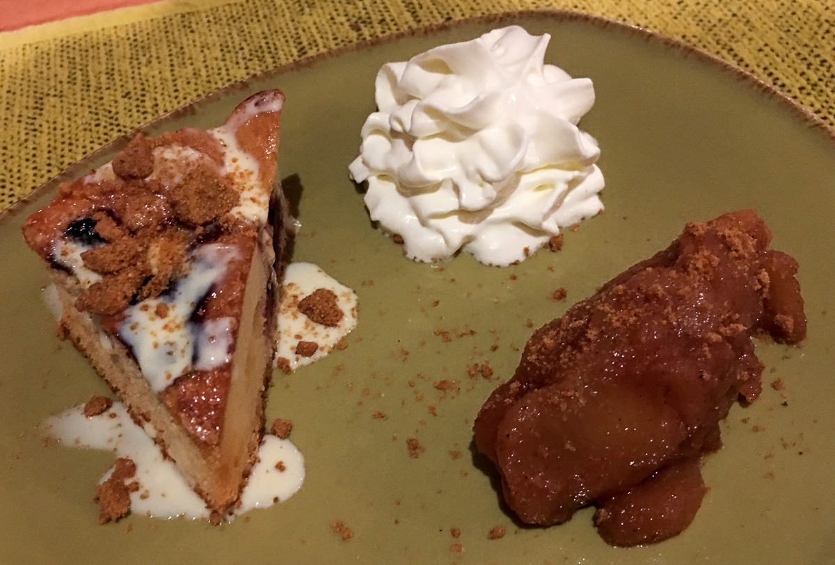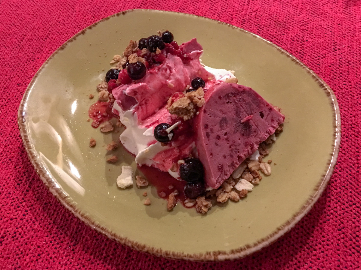 Jälkiruuat olivat upeita: kohdallemme osui karpalosorbettia kauniissa asetelmassa ja kuningatarpiirakkaa omenakompotilla.
