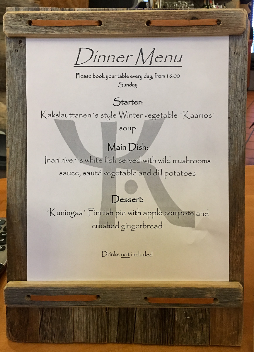 Jos Lappiin on vaikea saada sesonkityöläisiä niin keittiöön kuin saliin, niin ainakin keittiöön Kakslauttaseen on saatu osaavaa henkilökuntaa. Ja ihan mukaava ja osaava liettualainen tarjoilijamme Karlkin oli. Selvitettyämme puolin ja toisin mistä me ja hän olemme kotoisin, niin saimme sanan “kiitos” useimpien lauseiden loppuun.