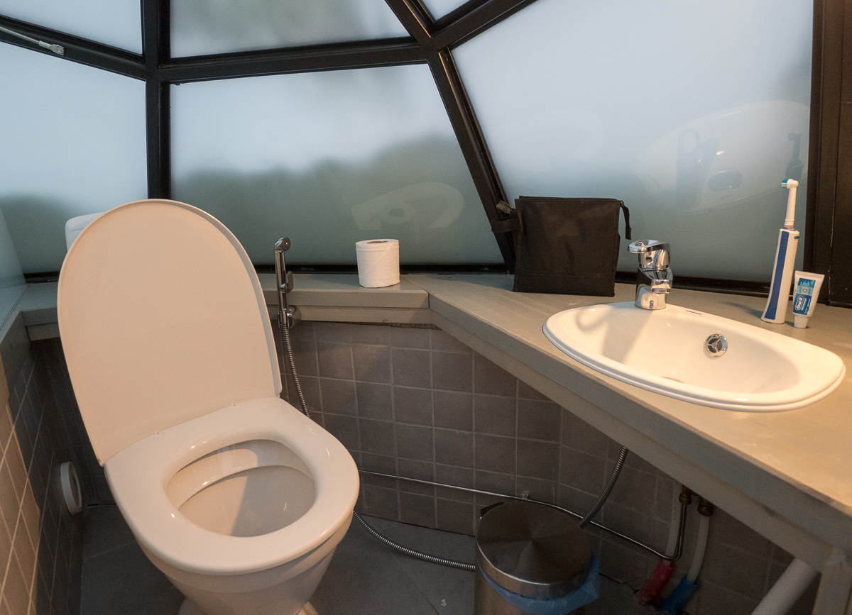 Ennen kuin pääsimme Sauli Niinistöön asti olemme käyneet päivän päätteeksi saunassa ja suihkussa. Pienissä kahden hengen lasi-igluissa ei ole suihkuakaan, mutta minikokoisessa pesualtaassa voi sentään pestä kasvot ja hampaat. Saunat ja suihkut (erikseen naisille ja miehille) ovat läheisessä hirsitalossa – kuten pienvenesatamissa tai leirintäalueilla konsanaan. Lyhyellä kahden yön vierailullamme tämä ei meitä haitannut, mutta pitemmällä vierailulla saattaisi tulla mieleen, että kyllä perinteisellä kylpyhuoneellakin hotellihuoneen yhteydessä on puolensa. Etenkin jos pakkaslukemat alittavat jo -20 astetta.