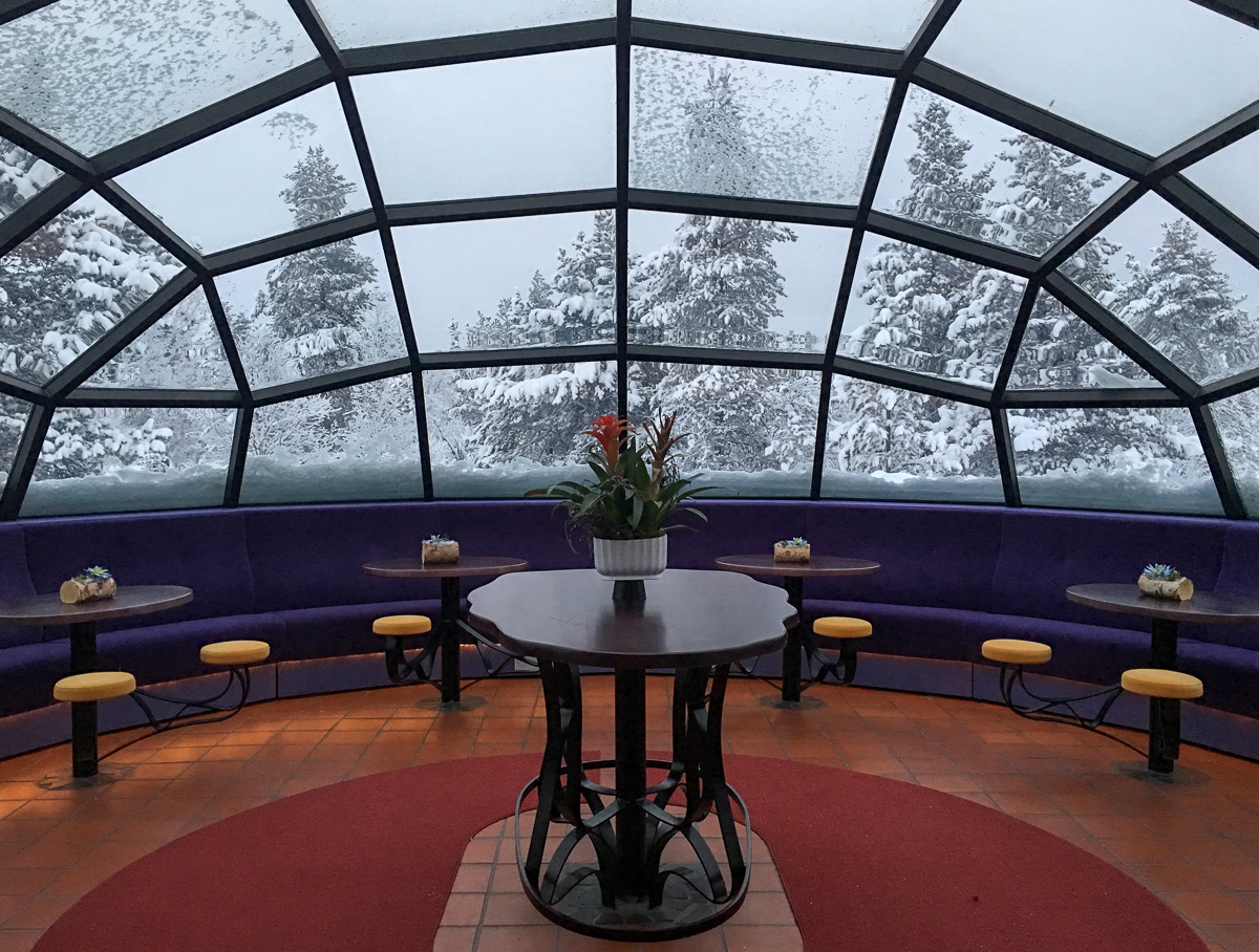 Olimme myös käyneet syömässä illallisen Aurora-ravintolassa, jossa myös aamiainen tarjoiltiin. Huoneen, tai siis iglun, hintaan kuului puolihoito, eli aamiainen ja kolmen ruokalajin illallinen (ilman ruokajuomia). Jos päivälläkin kaipasi ruokaa, niin tarjolla oli keittobuffet (hintaan 22 euroa per nuppi) – me pärjäsimme reilulla aamiaisella, omilla eväillä (hedelmiä ja proteiinipatukoita) ja illallisella.