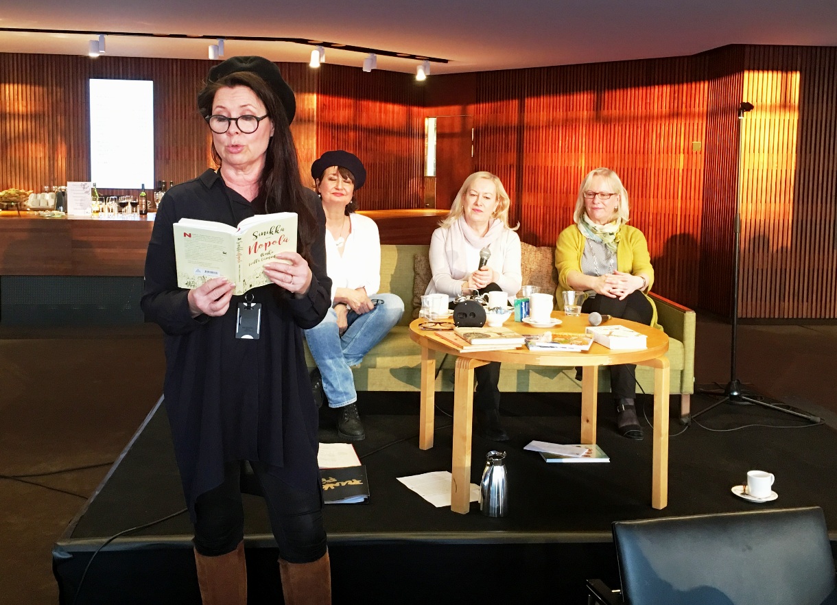 Kirjoittamisen maailmaa kävimme haistelemassa hiukan tänään alkuillastakin, sillä kävimme Helsingin kaupunginteatterin tilaisuudessa Kahvilla kirjailijan kanssa. Tässä kolmiosaisessa sarjassa olivat tänään vuorossa Sinikka ja Tiina Nopola, lastenkirjailijoina eivät ehkä ihan meidän juttumme, mutta halusin käydä katsomassa minkälaisesta tilaisuudesta on kyse ja tämä oli tarjolla olleista kolmesta vaihtoehdosta ainoa, joka sopi kalenteriimme. Kirjailijoita enemmän ilta oli kyllä enemmän konkarinäyttelijöiden Heidi Herala, Aino Seppo ja Eija Vilpas ilta, mutta toki heidän pienet esityksensä olivat näiden kirjailijoiden teksteistä.