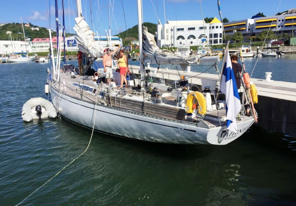 “Perjantaina 8.12. saavuimme odotetusti maaliin. Olin edellisenä yönä kannella ja näin jo rannan valot. Reittivalinnastamme johtuen ne olivat kylläkin Martiniquen valot. Nukuimme hetken ennen maaliintuloa ja miehistö herätettiin aamulla aikaisin ennen auringonlaskua kannelle. St. Lucian siluetti ja valot näkyivät selvästi ja suuntasimme kohti maalilinjaa auringon juuri noustessa. Valokuvaaja dinghyllä otti kuvia veneestä ja miehistöstä aamuruskon juuri valaistessa veneen kauniisti.