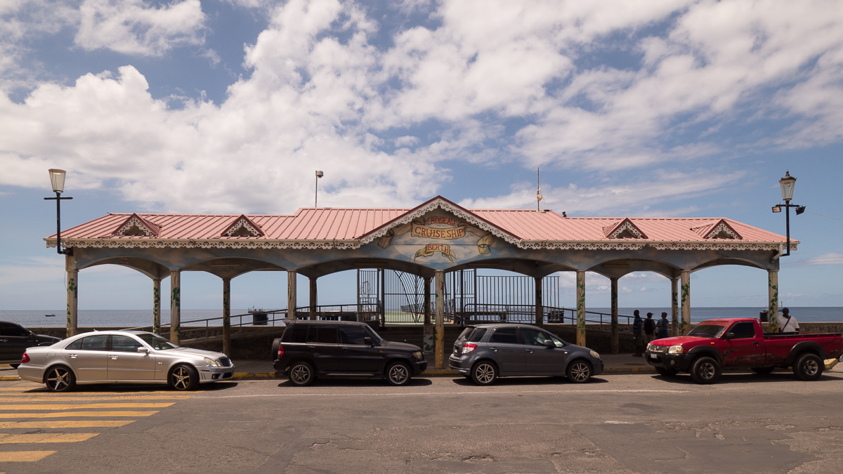 Palasimme rantaan ja löysimme risteilyaluslaiturin läheltä pienen torialueen, jossa muutama matkamuistoja myyvä koju tarjosi tänäänkin tuotteitaan meille harvoille matkailijoille ja ostimme Dominica-magneetin, jotain edes.