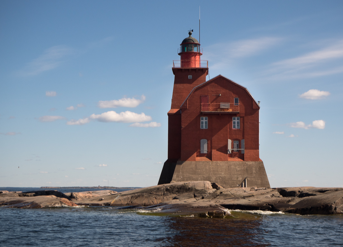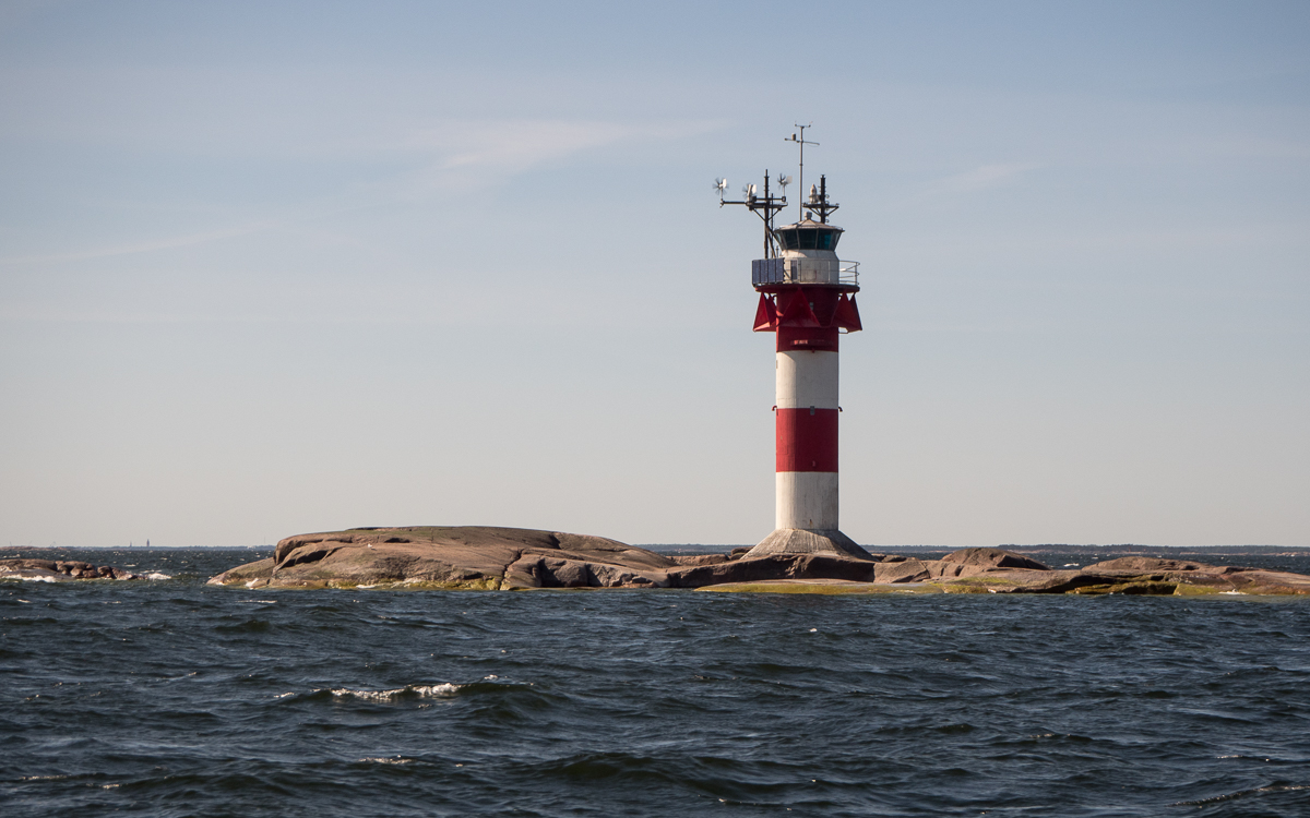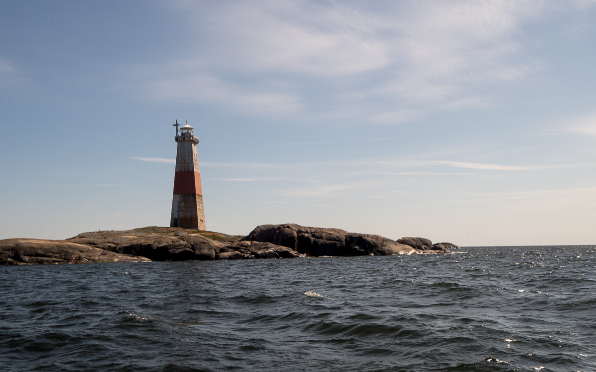 Sundharunin, eli Jussarön uuden majakan ohitimme merellä, veneen jo hienoisesti keikkuessa. Majakka oli ensimmäinen automaattikäyttöön rakennettu majakka, eli tällä luodolla ei ole yksikään majakanvartija koskaan asunut.
