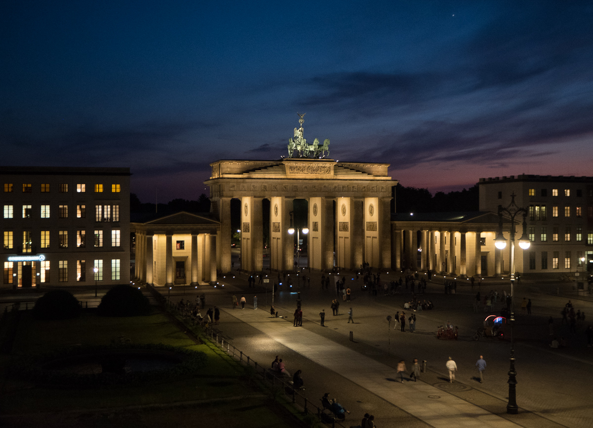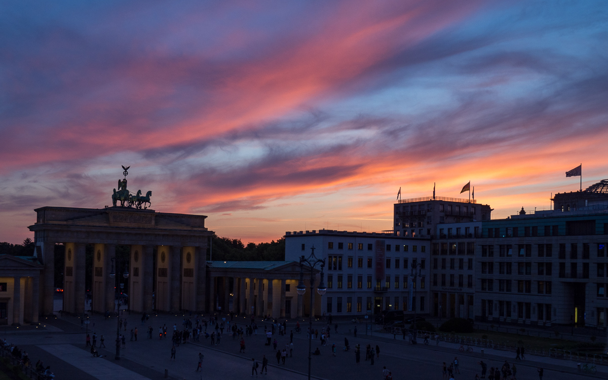 Illalla hotellille palatessamme näkymä Brandenburgin portille vangitsee meidät edelleen. Katsomme auringonlaskua minuutti minuutilta “kotisohvalta”.