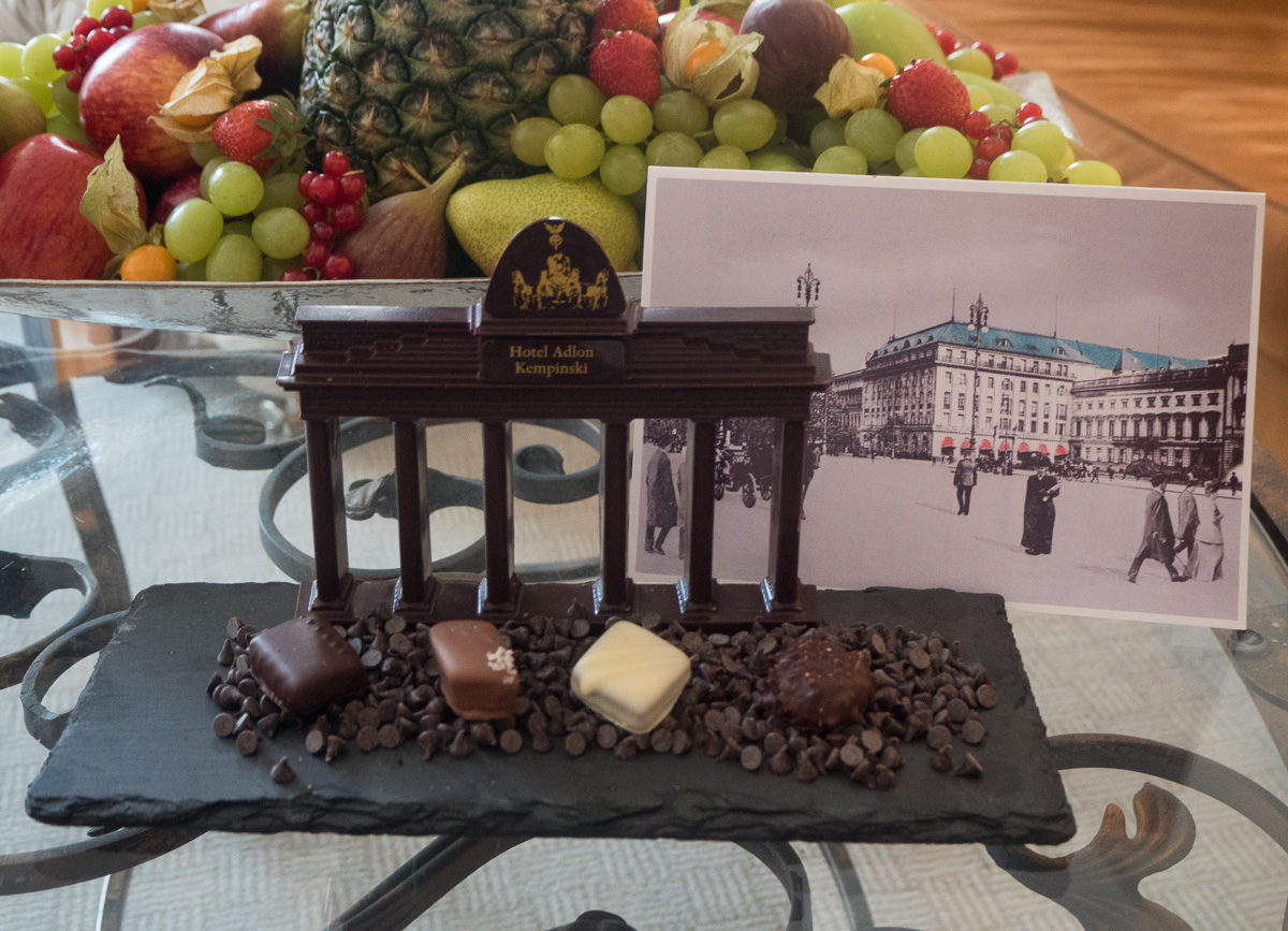 Sviitissämme meitä odotti shamppanja jäissä, hedelmätarjotin ja suklaata vuorokauden tarpeisiin. Mutta upeinta oli huoneestamme aukeava näköala Brandenburgin portille!