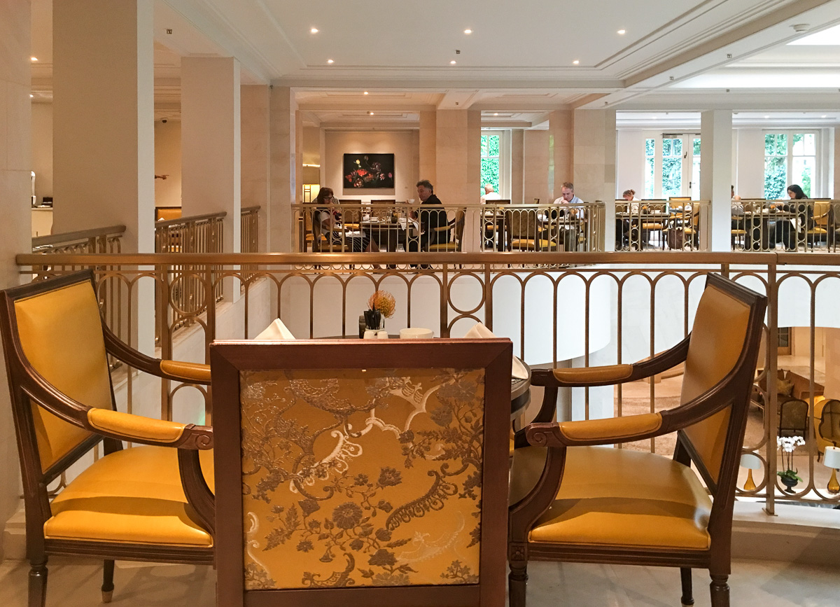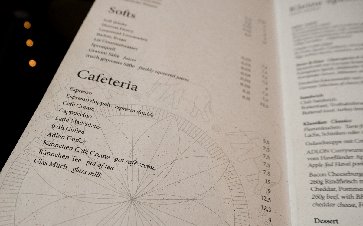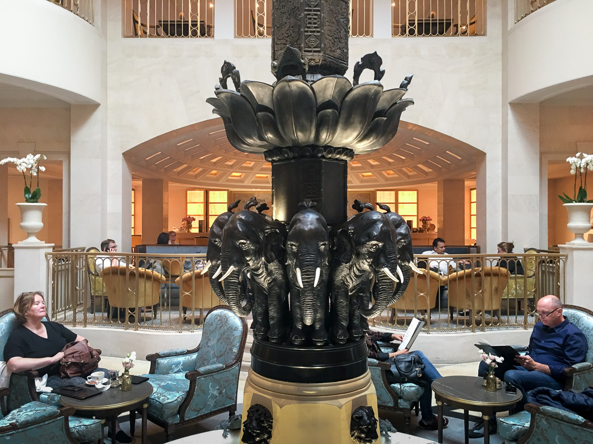 Hotellin ravintoloita emme aamiasta lukuunottamatta tällä kertaa ainakaan kokeilleet, aulan kahvilaa lukuunottamatta. Aulan kahvilan keskellä on televisiosarjastakin tuttu norsupatsas, joka on kuulemme toteutettu alkuperäisen hotellin pihalla ollutta patsasta mallina käyttäen. Cappuccino tarjotaan Brandenburgin portin logolla ja palvelu on nopeaa ja huomaavaista. Eivätkä hinnatkaan mielestämme olleet mitenkään järkyttäviä, eli jos haluat aistia hetken hotellin tunnelmaa, niin pistäydy vaikka kahvilla!