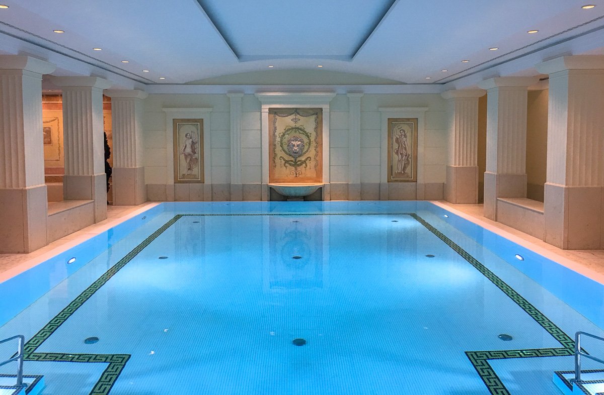 Kotiuduttuamme vuorossa onkin jo hotellin esittelykierros. Sabine kertaa meille hotellin historiaa ja on ehkä jopa hiukan vaikuttunut siitä, että televisiosarjan myötä tunnemme sen hyvin. Näemme hotellin ravintolat, talvipuutarhat ja sen verran isoja kokoustiloja, kuin niitä on vapaana. Vierailemme myös kylpylätiloissa ja uima-altaalla.