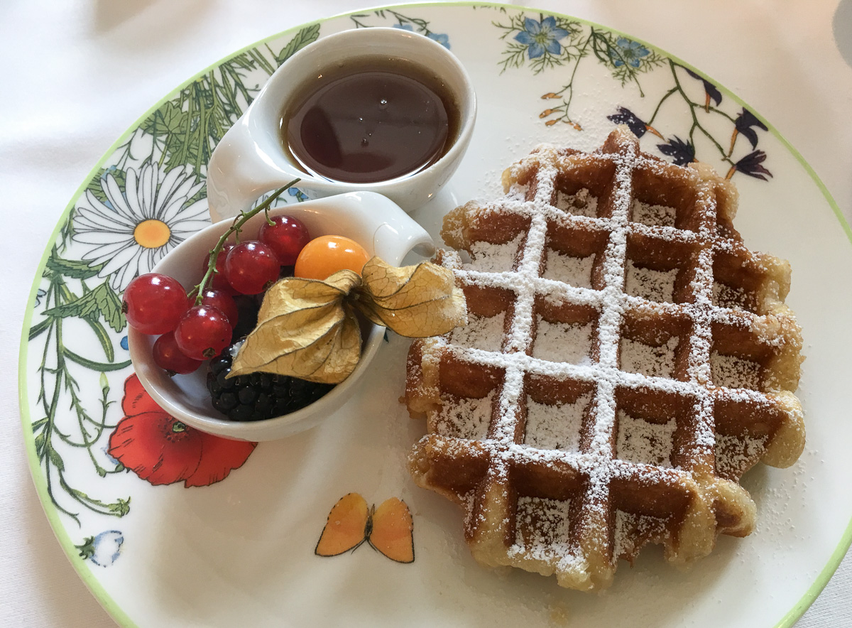 Aamiainen tuo mieleen loistoristeilijöillä nauttimamme aamiaiset. Tarjolla on runsas buffet, josta löytyy kaikki, mitä aamiaiselle voisi kaivata ja enemmänkin, mutta en olekaan aasialainen. Buffetin rinnalla on mahdollisuus tilata lämpimiä vaihtoehtoja pöytään ja tilaammekin belgialaisen vohvelin ja munakkaan. Buffetin erikoisemmasta päästä ovat ehkä valikoima kaviaareja, hotellin oma granola ja hotellin oma suklaalevite.