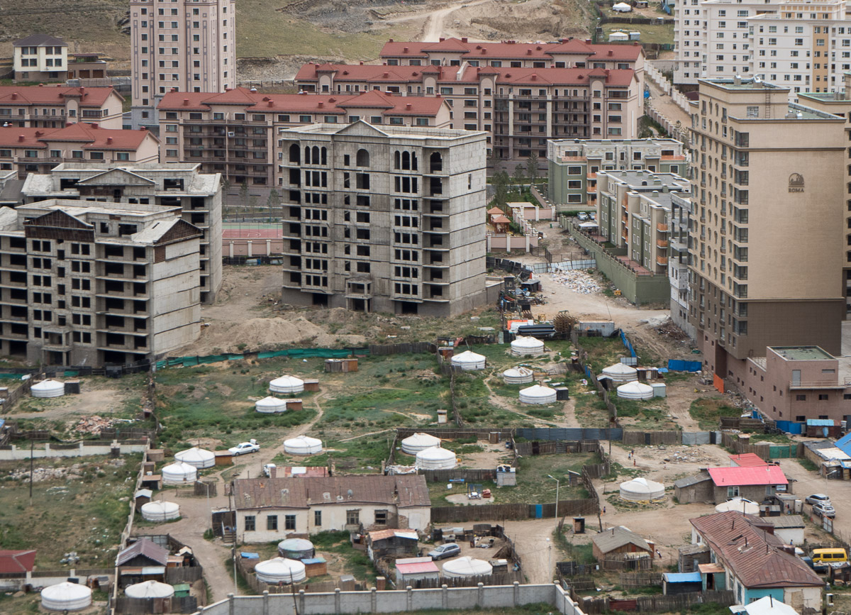 Gerejä näimme pääkaupungissa: siellä täällä kerrostalojen väleissä on yksittäisiä gerejä tai sopivilla vähän isommilla tonteilla pieniä ger-kyliä. Ison rakennustyömaan lähellä oli useita gerejä ja paikallisoppaamme kertoi rakentajien asuvan niissä.