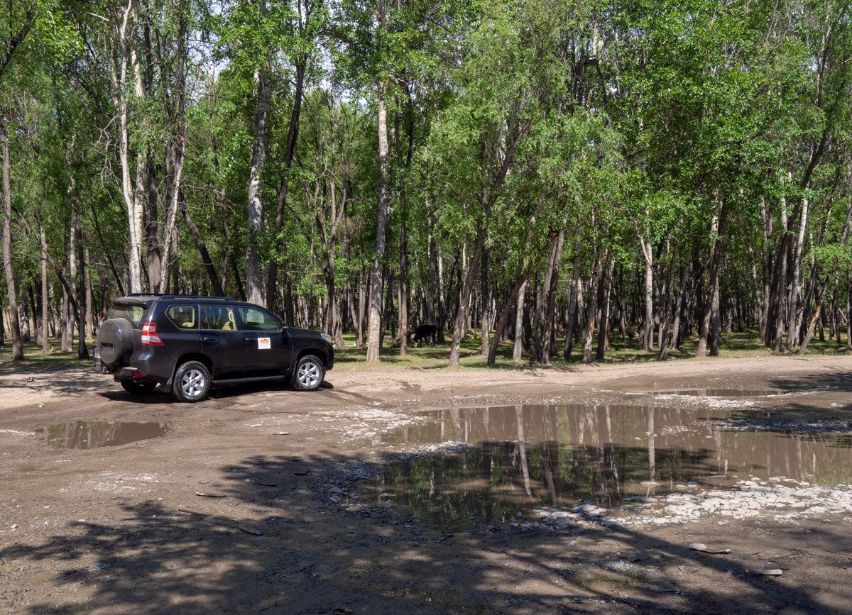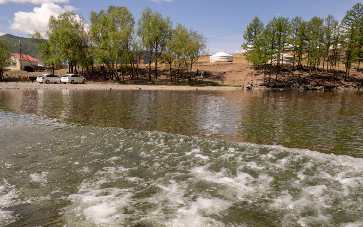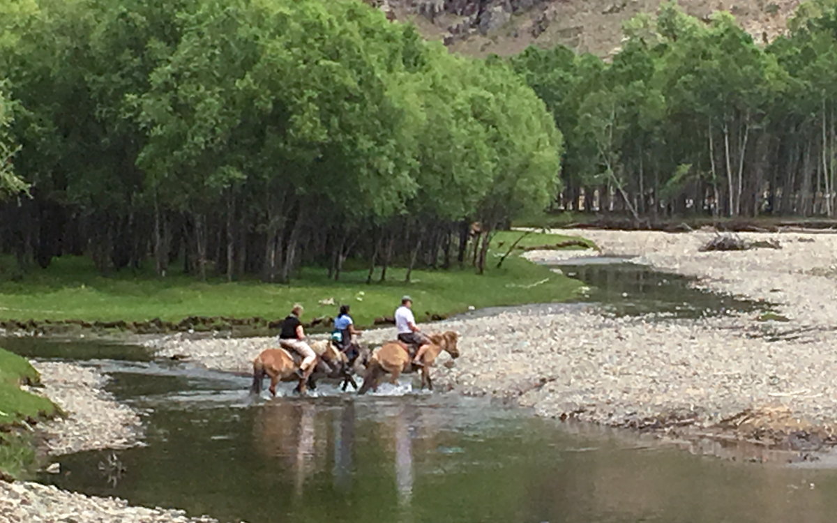 Matka Tereljin ger-leiristä paikallisen perheen luokse sujui aluksi ihan tavanomaisesti maastoautossa istuen, mutta sitten pysähdyimme joen rannalle ja kuljettaja kävi kysymässä jotain rannalla oleskelevilta ihmisiltä. Vähän arvelimme, että meidät haettaisiin jollain veneellä joen yli ja jatkaisimme sieltä toisella autolla. Mutta ei, kuljettajamme oli vaan tarkistanut joen tilannetta ja saanut vahvistuksen sille, että yli voi ajaa – maastoautolla, joten matkamme jatkui edelleen autolla, yli ensimmäisen joen ja useamman muunkin, vähän pienemmän joen, ennenkuin saavuimme perille.