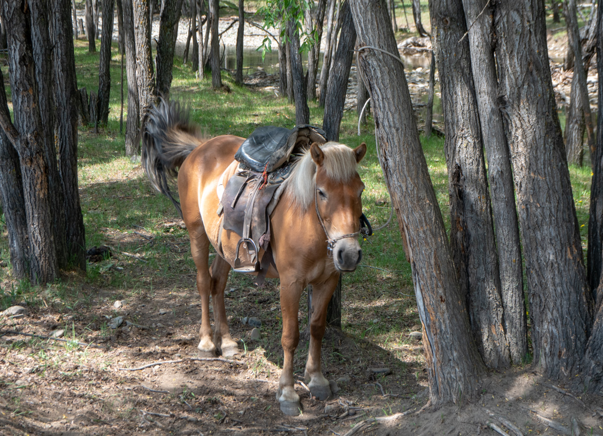 Ger, jossa olimme vierailleet, oli joen rannalla, joten lähes ensimmäiseksi ylitimme tämän pienen joen. Hevosten laskeutuessa alas joen törmältä saimme jo tuntumaa siihen, mitä tuleman pitää – tasapainon eteen saa ajoittain tehdä vähän töitä! Joessa hevoset pitivät jo ensimmäisen juomatauon ja niin mekin saimme sitten taipua eteenpäin antaessamme hevosille mahdollisuuden tähän ohjaksista kiinnipitäen.