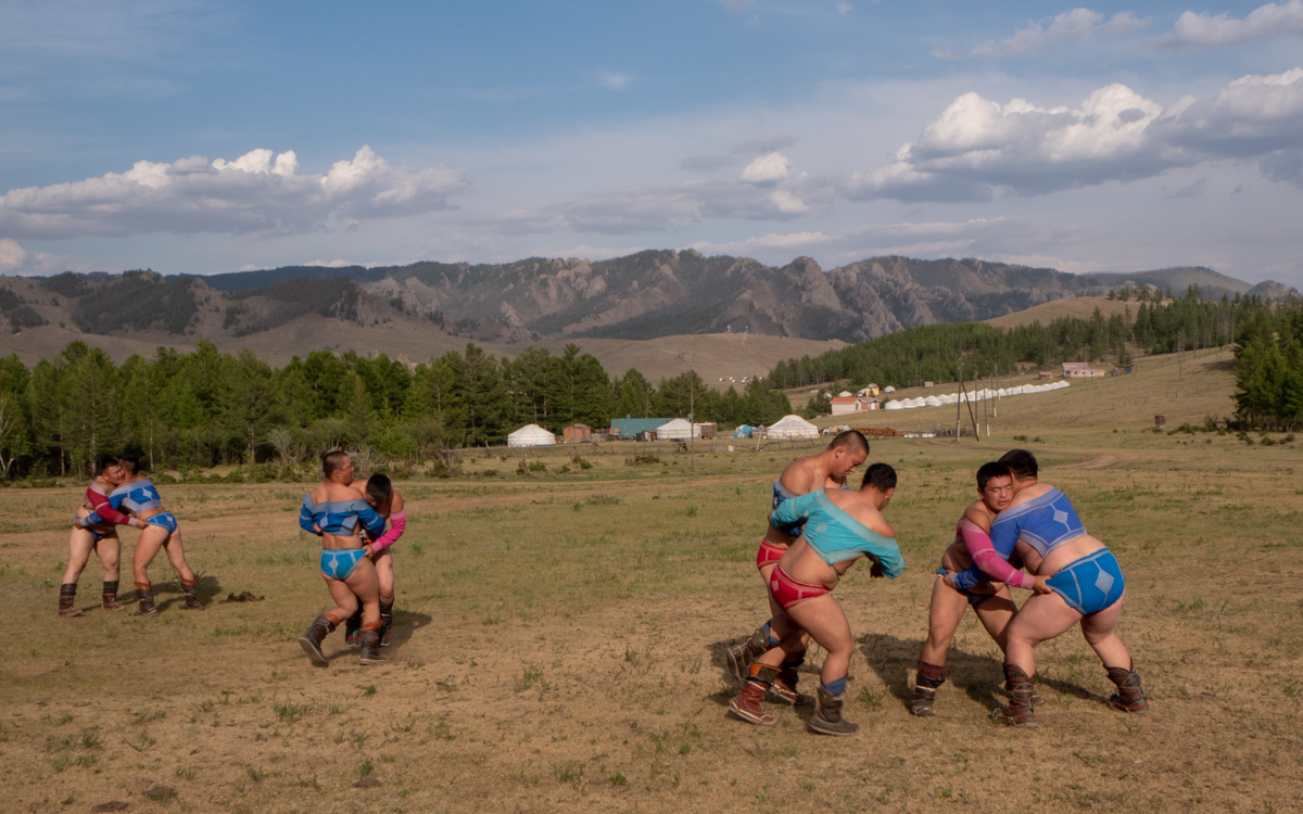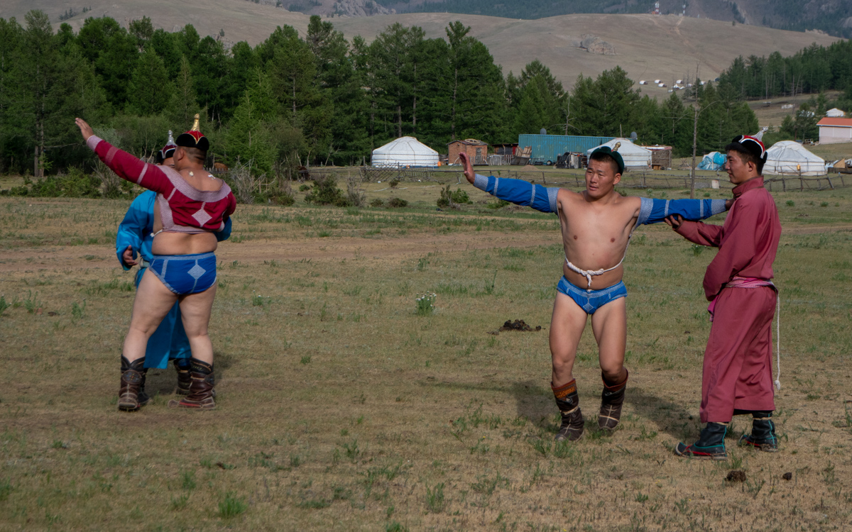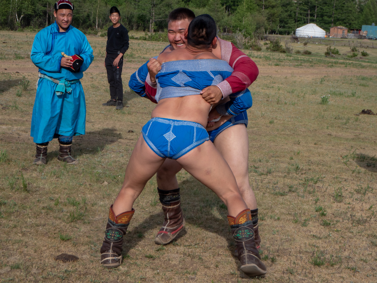 Mongolialaisesta painista tuli ensin mieleen sumopaini, vaikkemme sumopainia koskaan olekaan nähneet paitsi televisiossa: sen verran tukevia useimmat painijat olivat. Seuraavaksi meitä huvittivat painijoiden asut: pienet uimahousun tapaiset housut, samanvärinen bolerontapainen lyhyt yläosa ja syystä tai toisesta valkoinen narunpätkä vyöksi solmittuna. Jalkineina miehillä oli perinteiset mongolialaiset nahkasaappaat.