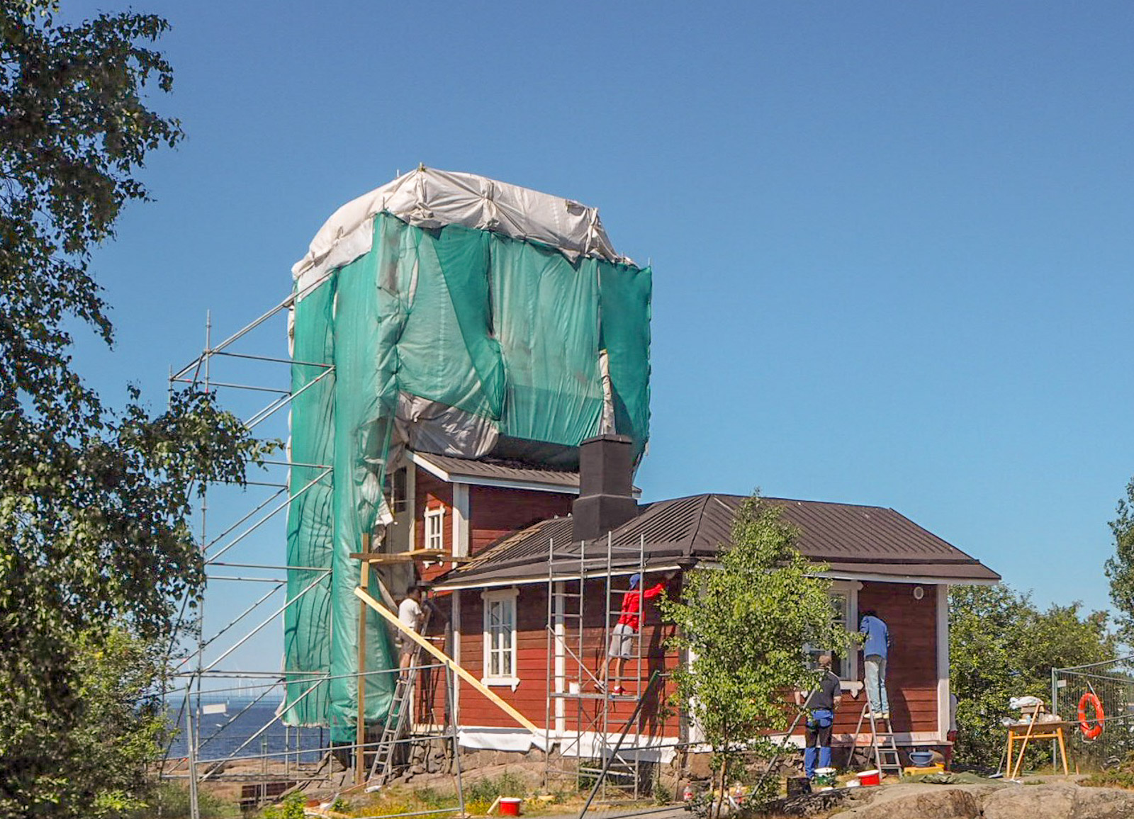 Ja remontissahan se oli, huputettuna, mutta toisaalta tilanne on siis toiveikas: luultavasti vielä tänä kesänä hupun alta paljastuu entistä ehompi Kallon majakka.
